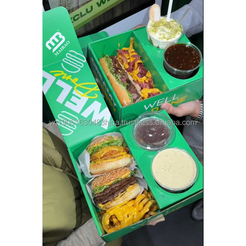 กล่องคอมโบเบอร์เกอร์แบบใช้แล้วทิ้งสำหรับร้านอาหารฟาสต์ฟู้ด พร้อมที่ใส่แก้ว แบ่งช่องใส่เฟรนช์ฟรายส์ ไก่ และอาหารอื่นๆ