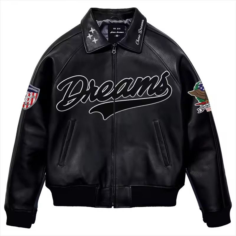 แจ็คเก็ตเบสบอลสำหรับผู้ชายหนัง100% โลโก้ออกแบบได้ตามต้องการสำหรับฤดูหนาว