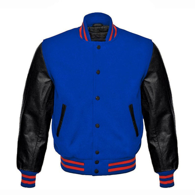 แจ็คเก็ตหนังแท้สไตล์ Letterman Varsity College Bomber สีน้ำเงิน แขนหนังวัวแท้สีดำ