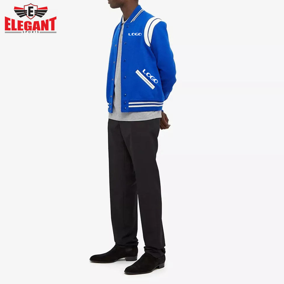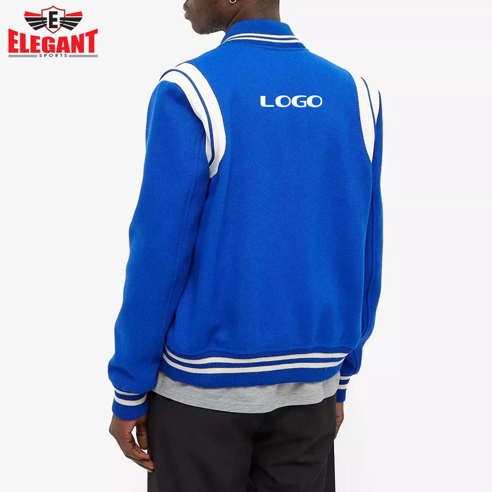 เสื้อแจ็คเก็ตเบสบอลแบบวาร์ซิตี้ผ้าแคนวาสคุณภาพสูงสำหรับผู้ชาย คอตั้ง พร้อมโลโก้ด้านหน้า โดย ELEGANT SPORTS