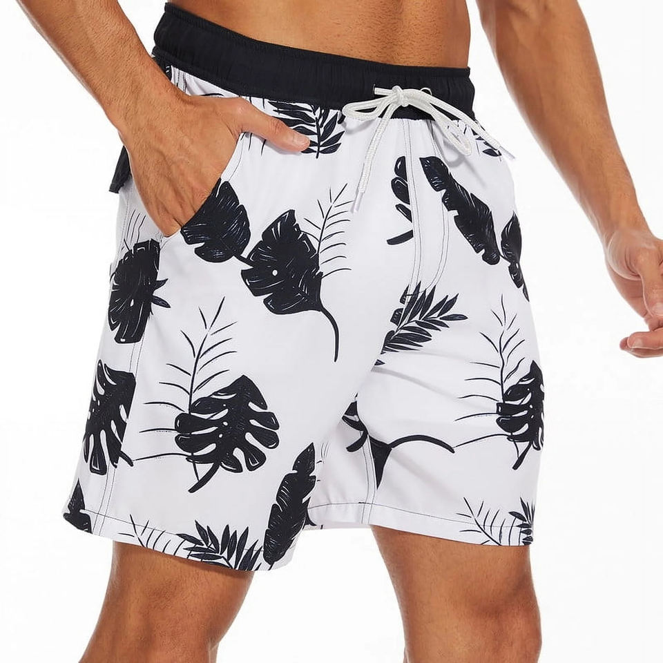 กางเกงขาสั้นผู้ชายแบบแห้งเร็ว ผลิตจากวัสดุรีไซเคิล ยืดหยุ่นได้ เหมาะสำหรับใส่เล่นน้ำชายหาด ผลิตจากโพลีเอสเตอร์ผสมสแปนเด็กซ์ ระบายอากาศได้ดี ลายพิมพ์สปอร์ต