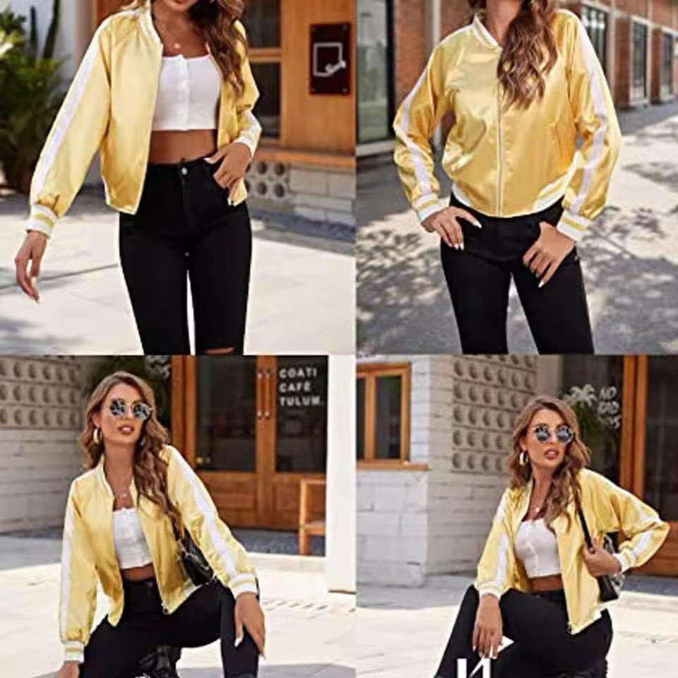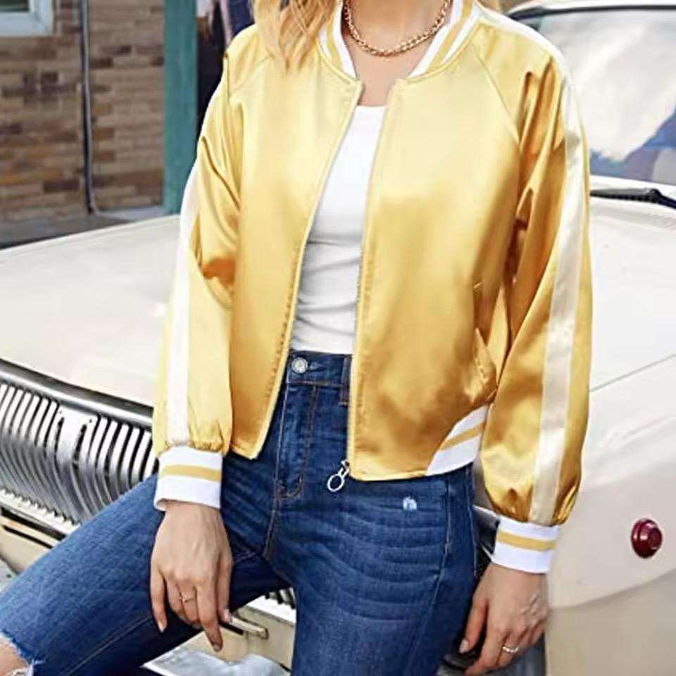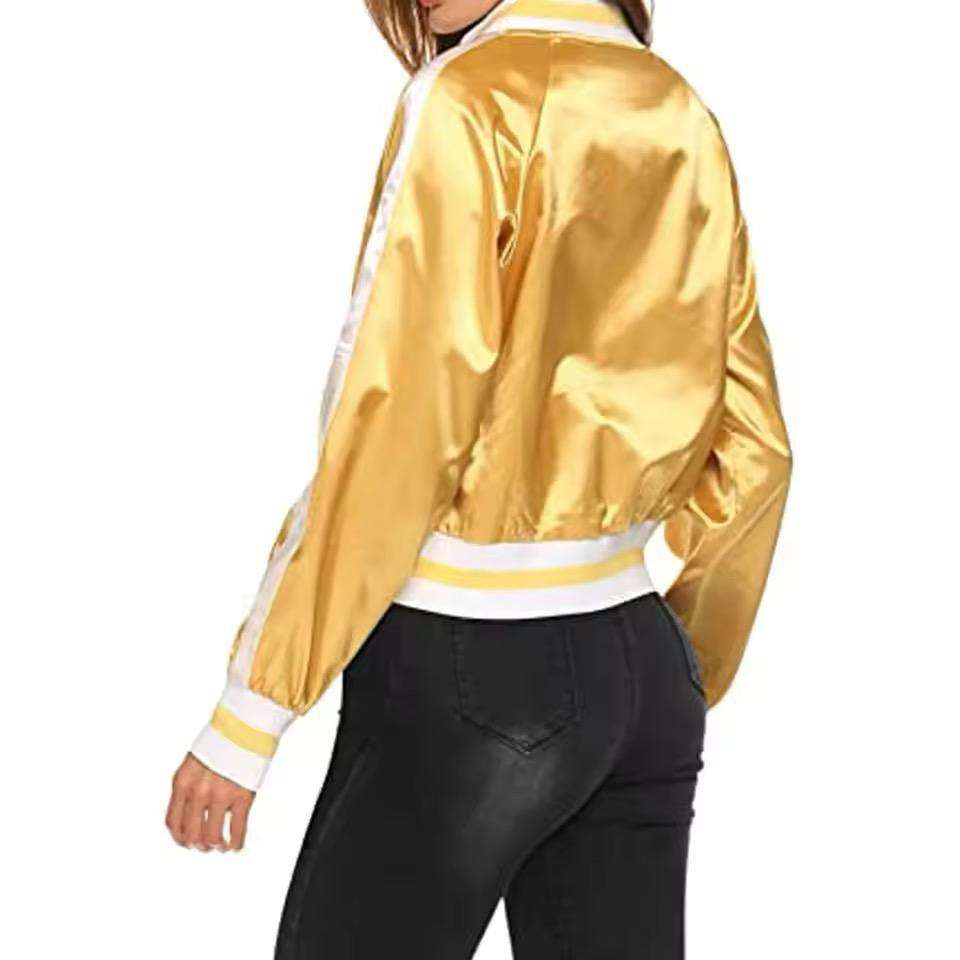 เสื้อแจ็กเก็ตบอมเบอร์ผ้าแคนวาสสำหรับผู้หญิงผ้าซาตินปกตั้งและโลโก้ปักด้านหน้าสำหรับฤดูหนาว