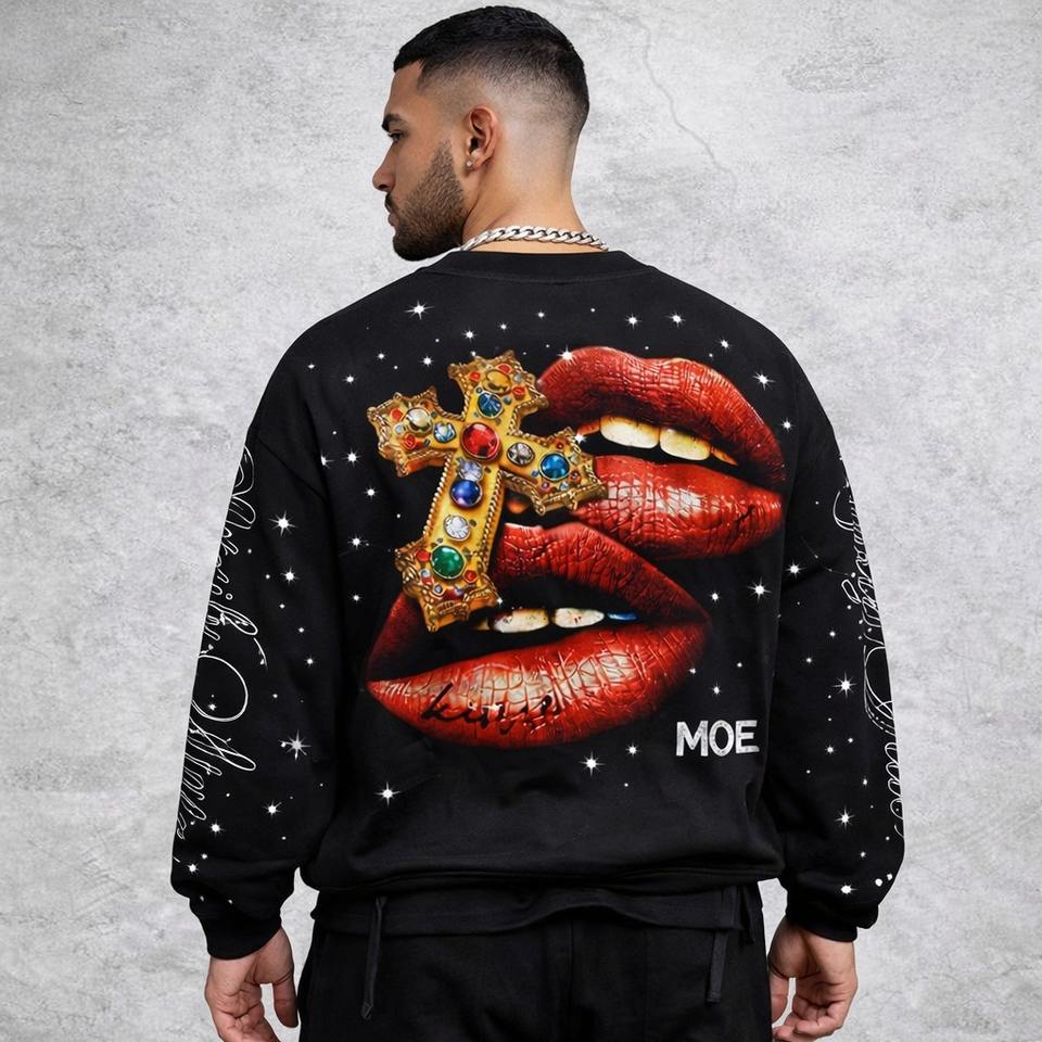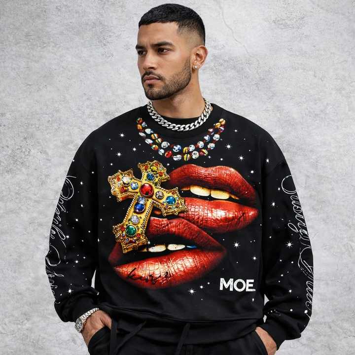 Custom Rainbow-Spray Sparkly Vintage Street Style Distress Saint Graphic Long Sleeve Crew Neck Men's shirts Rhinestone Crop Tee