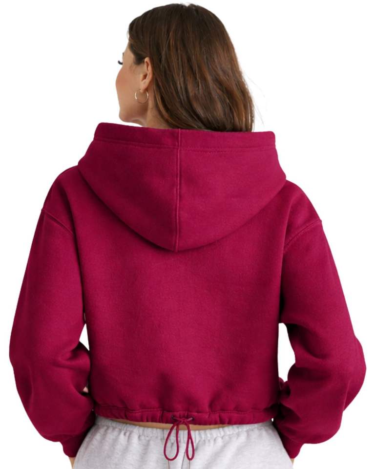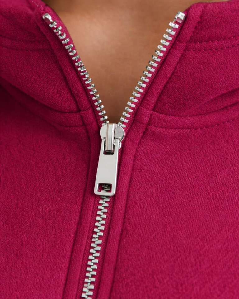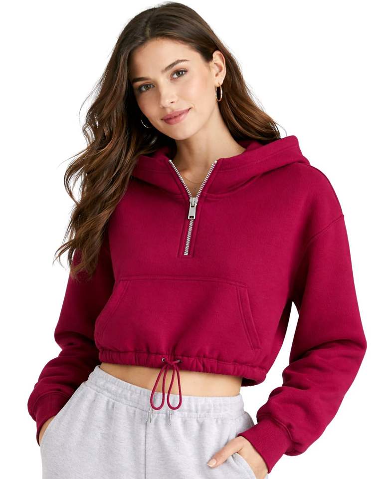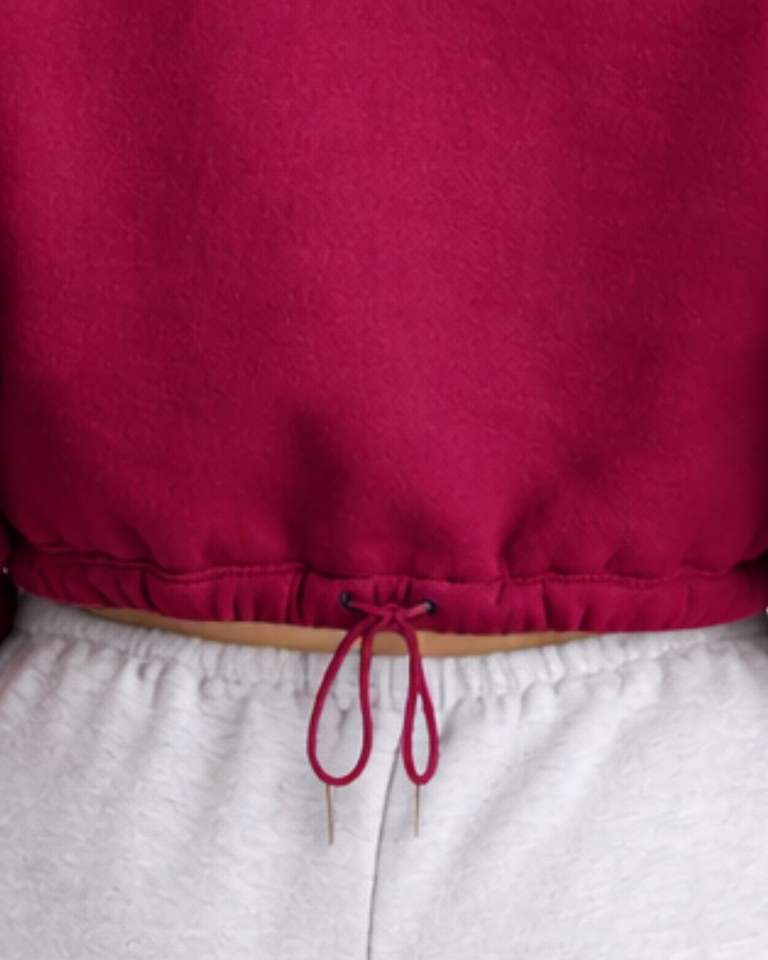 เสื้อฮู้ดครอปสีแดงแบบกำหนดเอง ผ้าฟลีซ ซิป ¼ กระเป๋าคางูโร่ ชายเสื้อปรับได้ด้วยเชือกผูก สไตล์ลำลอง สตรีทแวร์ เสื้อกันหนาวแบบสวมหัวสำหรับผู้หญิง