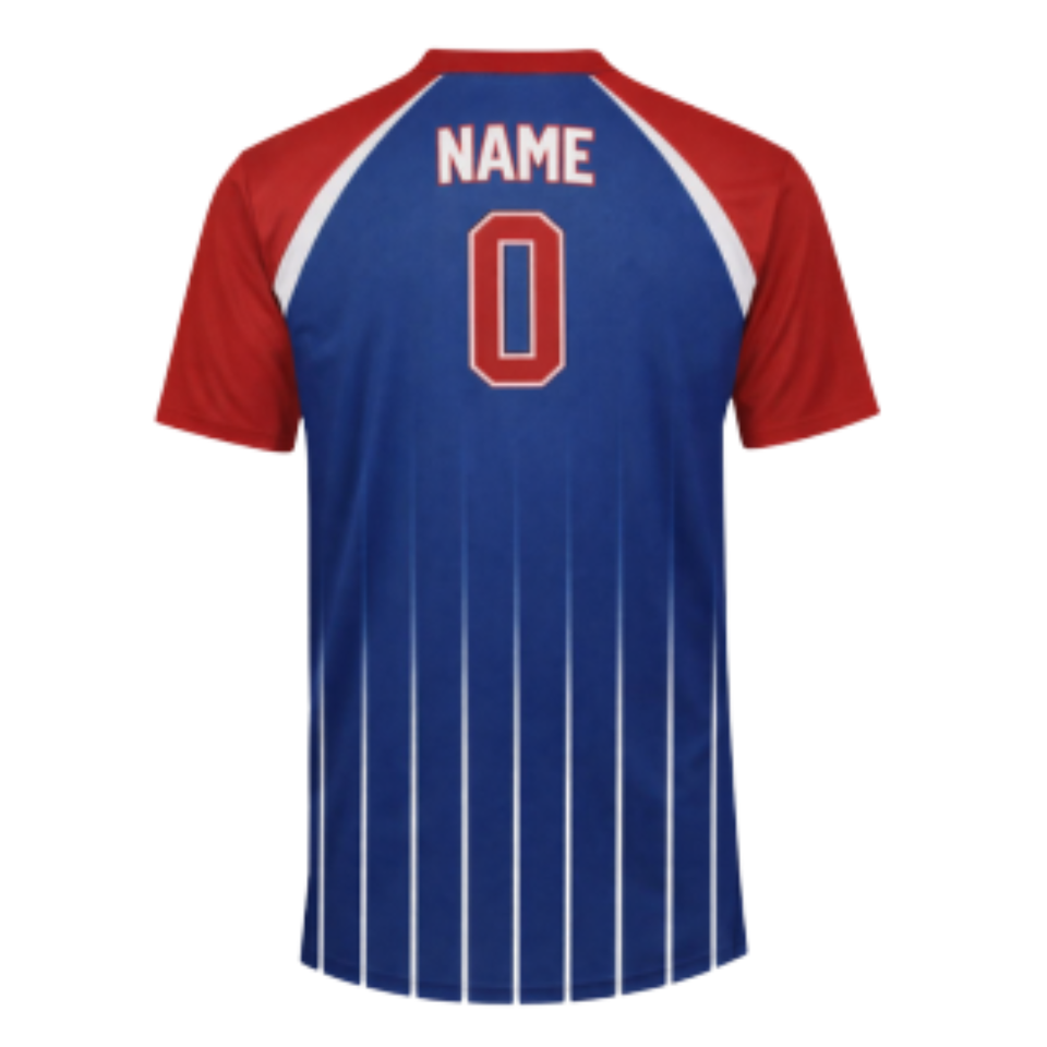 เสื้อเบสบอลสีแดงและสีน้ำเงินแบบสั่งทำพิเศษ พร้อมดีไซน์ติดกระดุม ปรับแต่งหมายเลขผู้เล่นและสีทีมได้ สำหรับชุดกีฬาผู้ชาย
