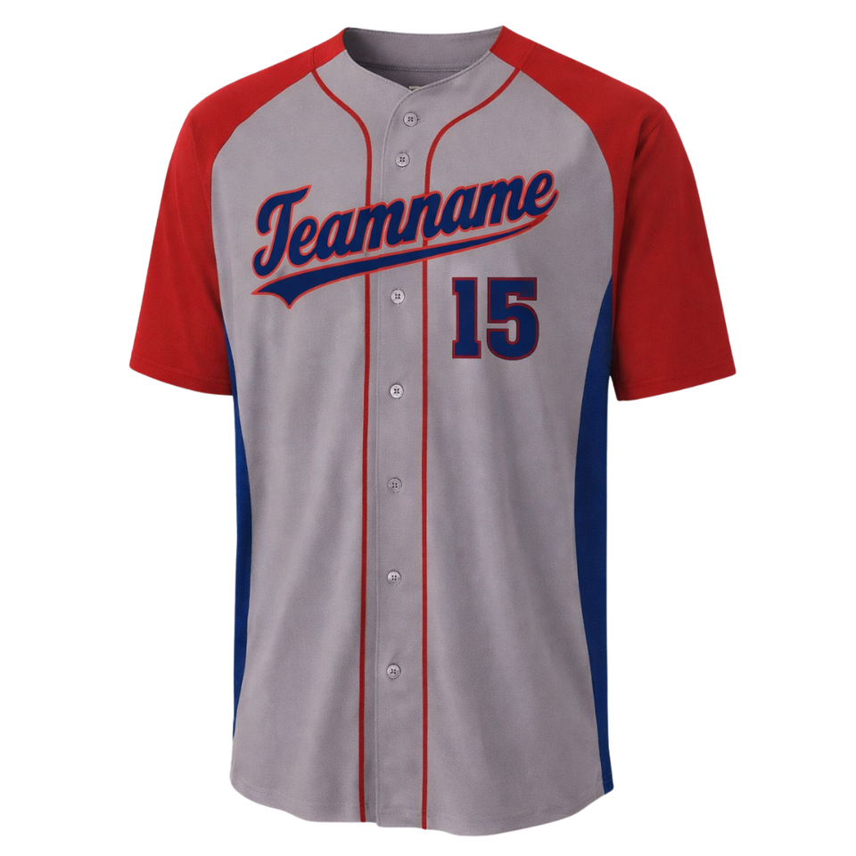 ชื่อทีมเสื้อเบสบอลสีแดงและสีเทาแบบกำหนดเอง พร้อมรายละเอียดผู้เล่นที่ปรับแต่งได้และผลิตได้อย่างรวดเร็ว