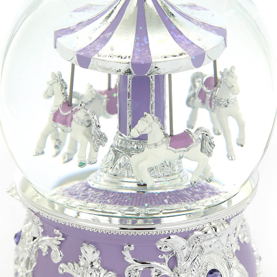 ลูกโลกหิมะทำจากเรซินเทียมแบบกำหนดเองม้าหมุนสีม่วงลาเวนเดอร์สำหรับดนตรีน้ำลูกโลกของขวัญตกแต่งวันคริสต์มาส