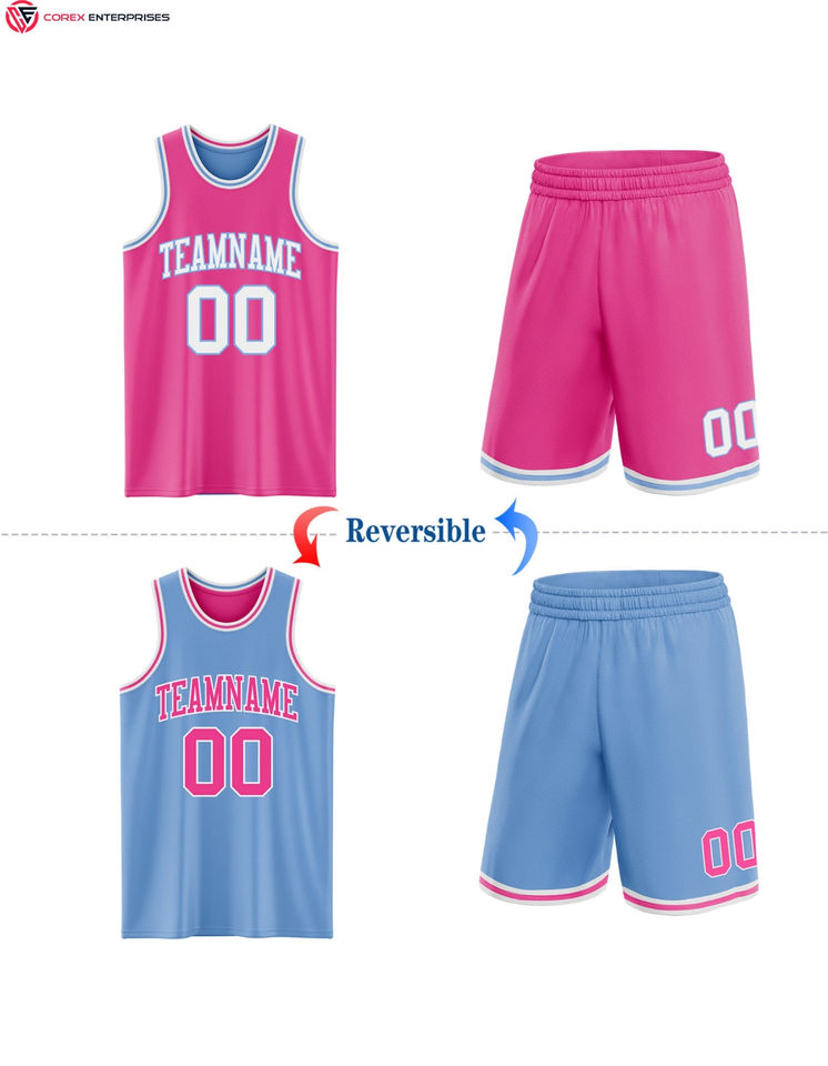 เสื้อเจอร์ซีย์บาสเก็ตบอลพิมพ์ซับลิเมชันสองด้านสีชมพูดำ-ฟ้าฟ้า
