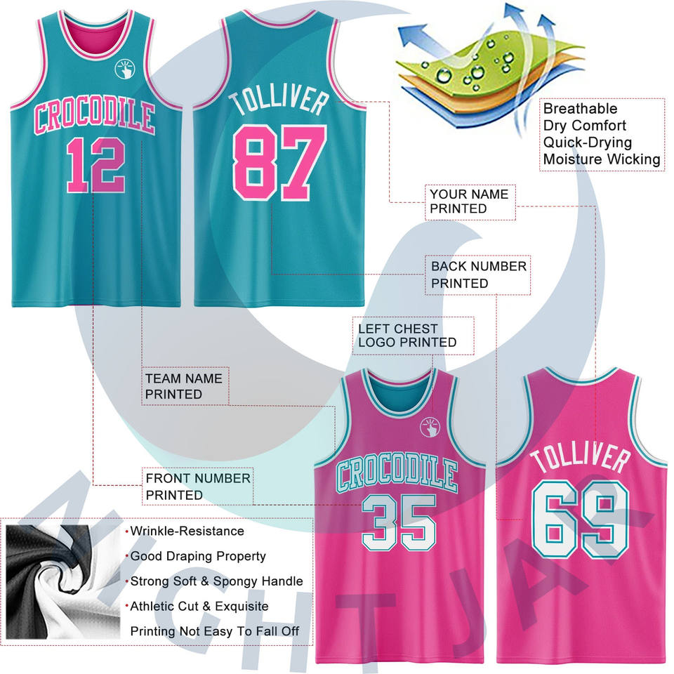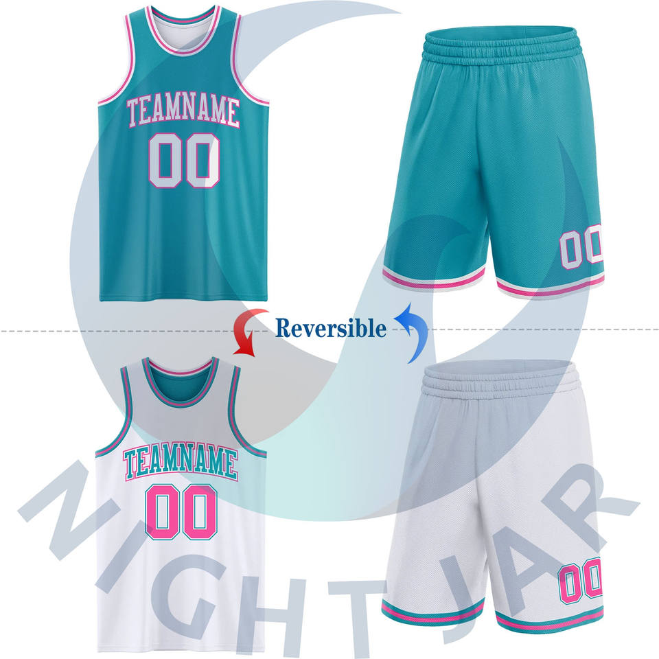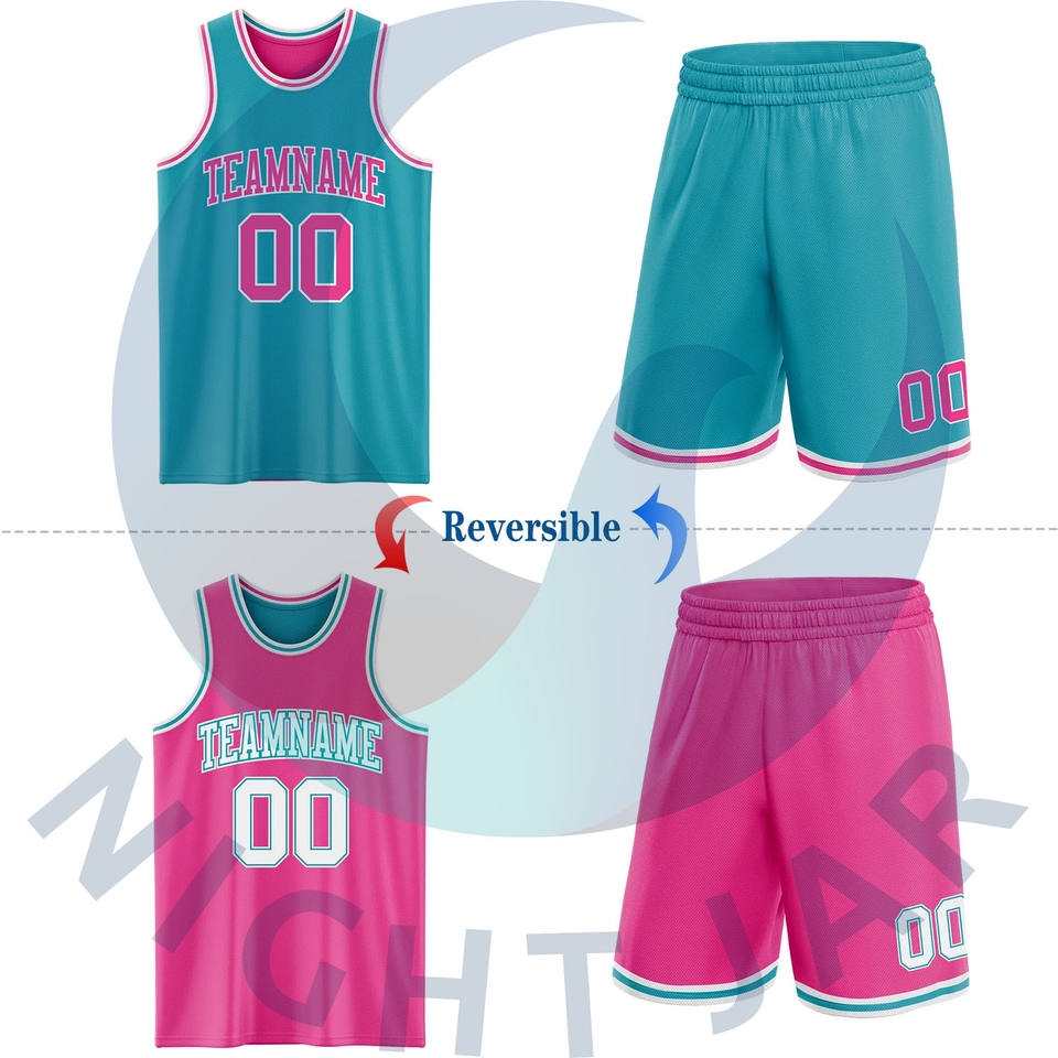 เสื้อเจอร์ซีย์เล่นบาสเก็ตบอลพิมพ์ลายสองด้านสีชมพู-ขาวแบบกลับด้านได้กำหนดเอง