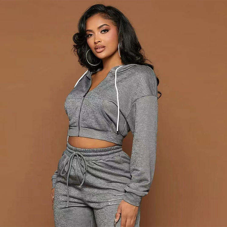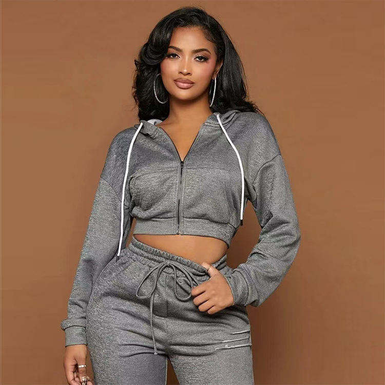 ชุดเซ็ตฮู้ดดี้ซิปสองชิ้นปักโลโก้ด้วยคริสตัลแบบกำหนดเอง และกางเกงขายาวทรงตรงสำหรับผู้หญิง คุณภาพสูง เหมาะสำหรับสาวรูปร่างสูง ชุดวอร์มกำมะหยี่