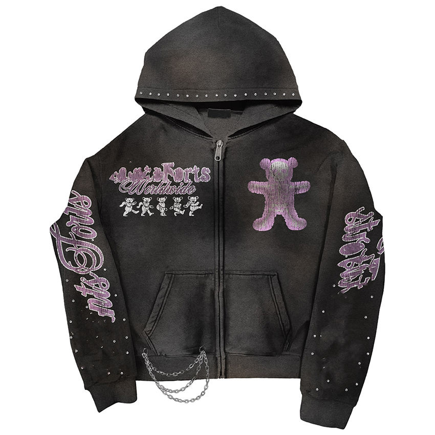 เสื้อฮู้ดดี้ครอปทรงโอเวอร์ไซส์ แต่งคริสตัลวิบวับ สไตล์วินเทจ ล้างสีแบบแอซิดวอช ผ้าหนา ซิปหน้า สำหรับผู้ชาย