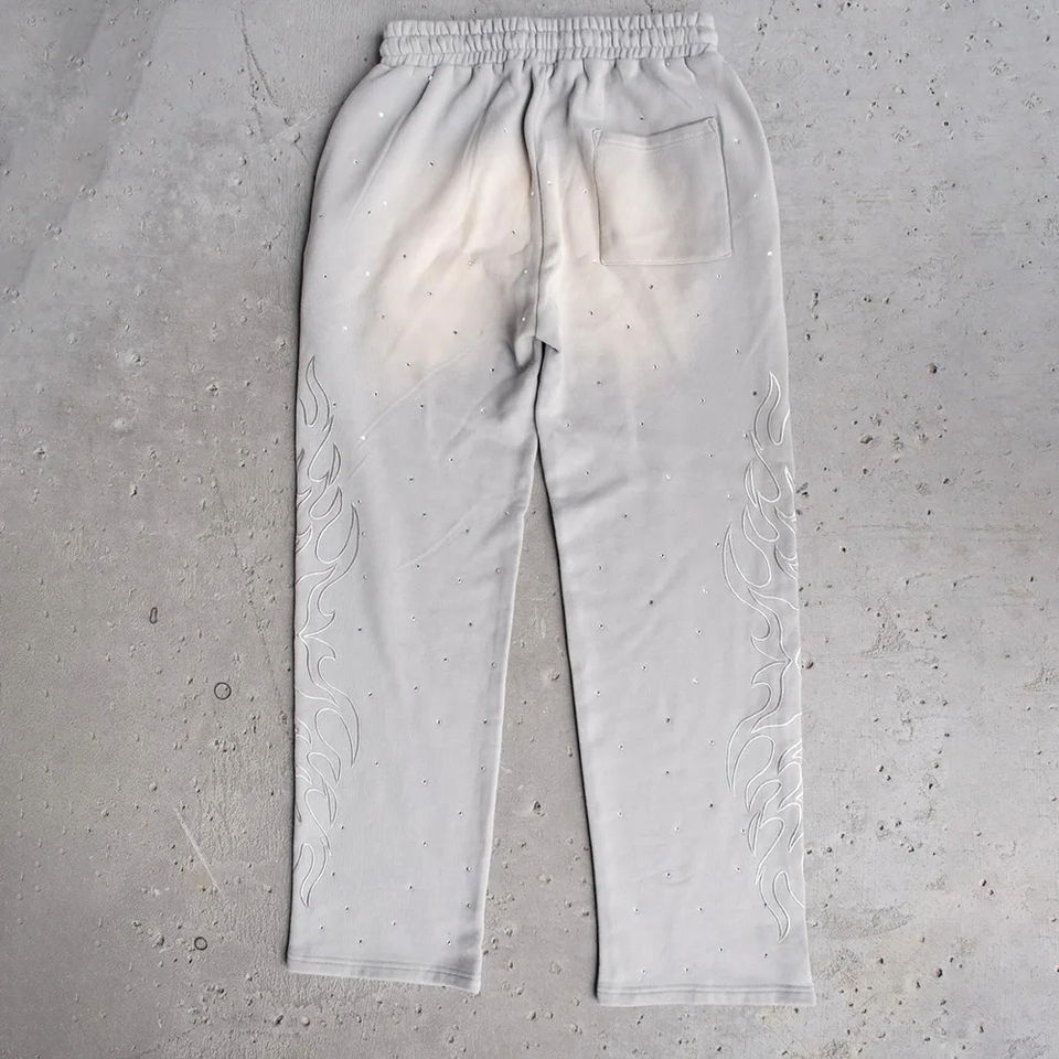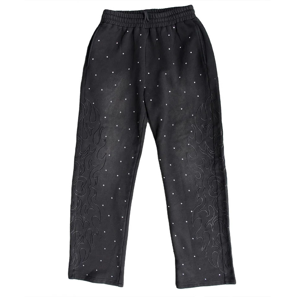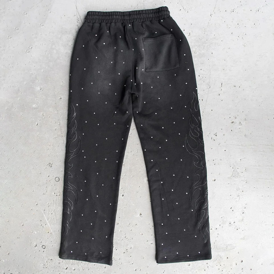 กางเกงวอร์มปักลายเพชรแบบกำหนดเอง ผ้าคอตตอนหนานุ่ม ทรงขาบาน กางเกงจ็อกเกอร์ผ้าหนาสำหรับผู้ชาย ปักลาย ล้างสีแบบแอซิดวอช ทรงขากว้าง