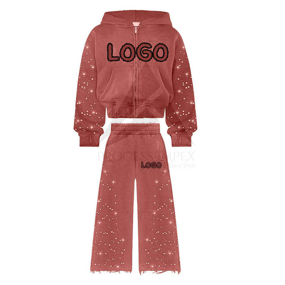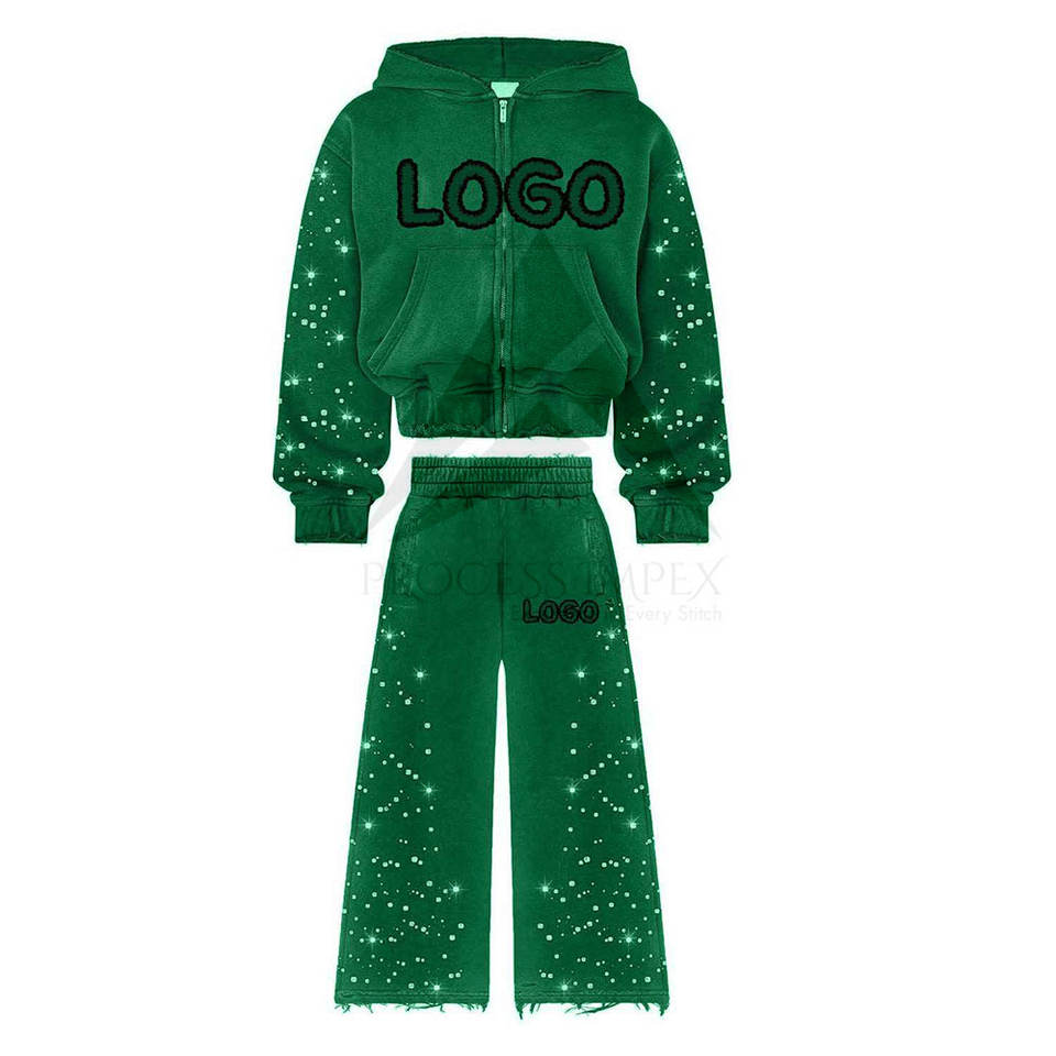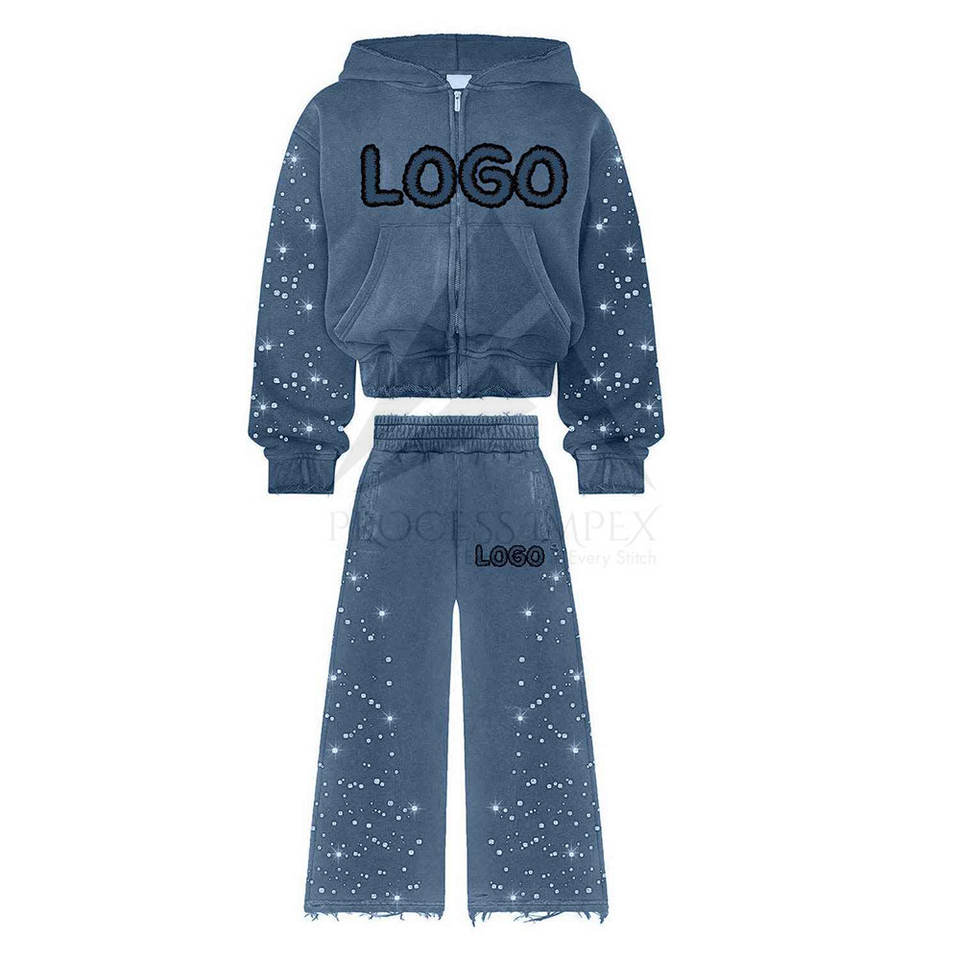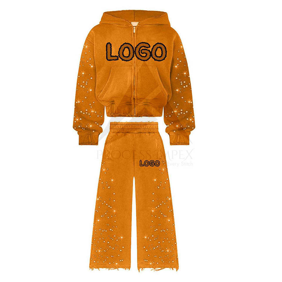 ชุดวอร์มประดับคริสตัลแบบกำหนดเองสำหรับผู้ชาย เสื้อฮู้ดและกางเกงขายาวประดับคริสตัล ชุดสตรีทแวร์พรีเมียม กระบวนการผลิตแบบ OEM ODM Impex