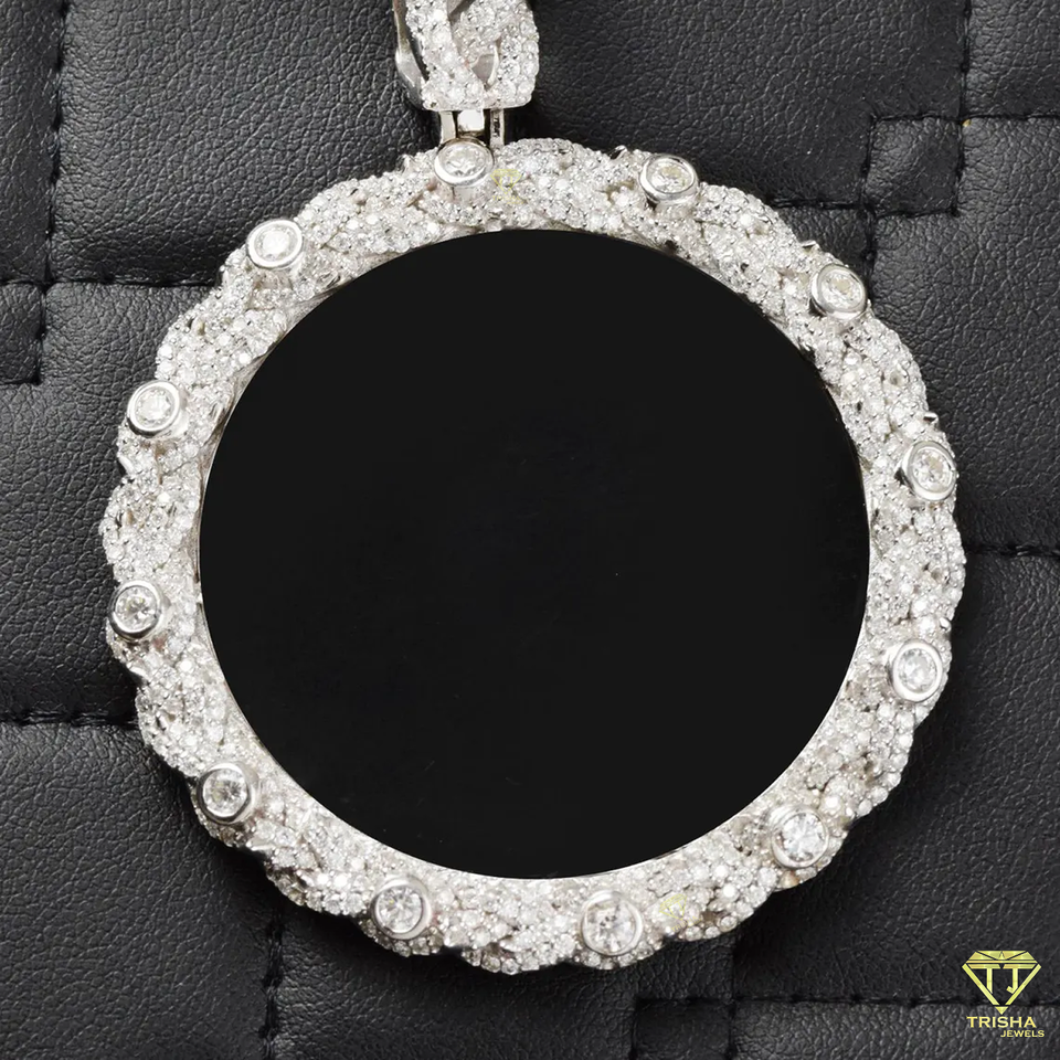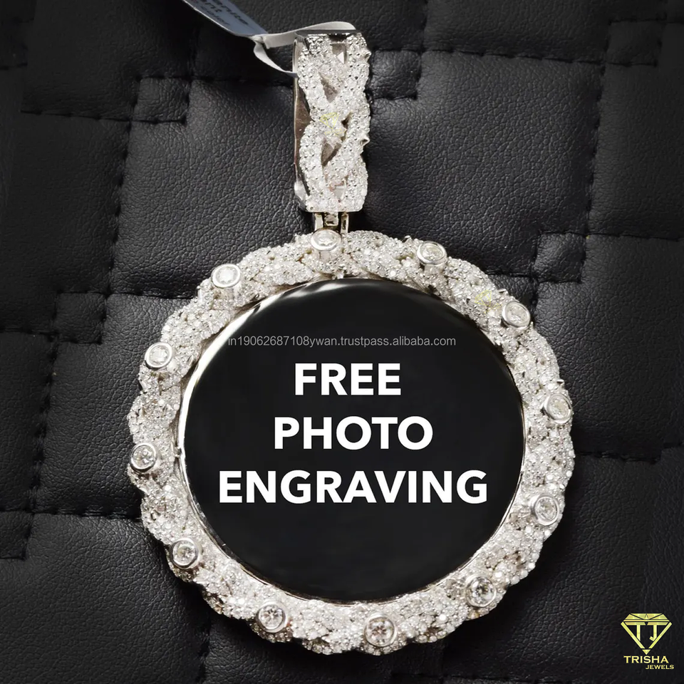 จี้รูปทรงกลมที่กำหนดเองพร้อมกรอบภาพในห้องทดลอง VVS น้ำแข็งสลักด้วยเงินสเตอร์ลิง925เครื่องประดับความทรงจำส่วนตัว