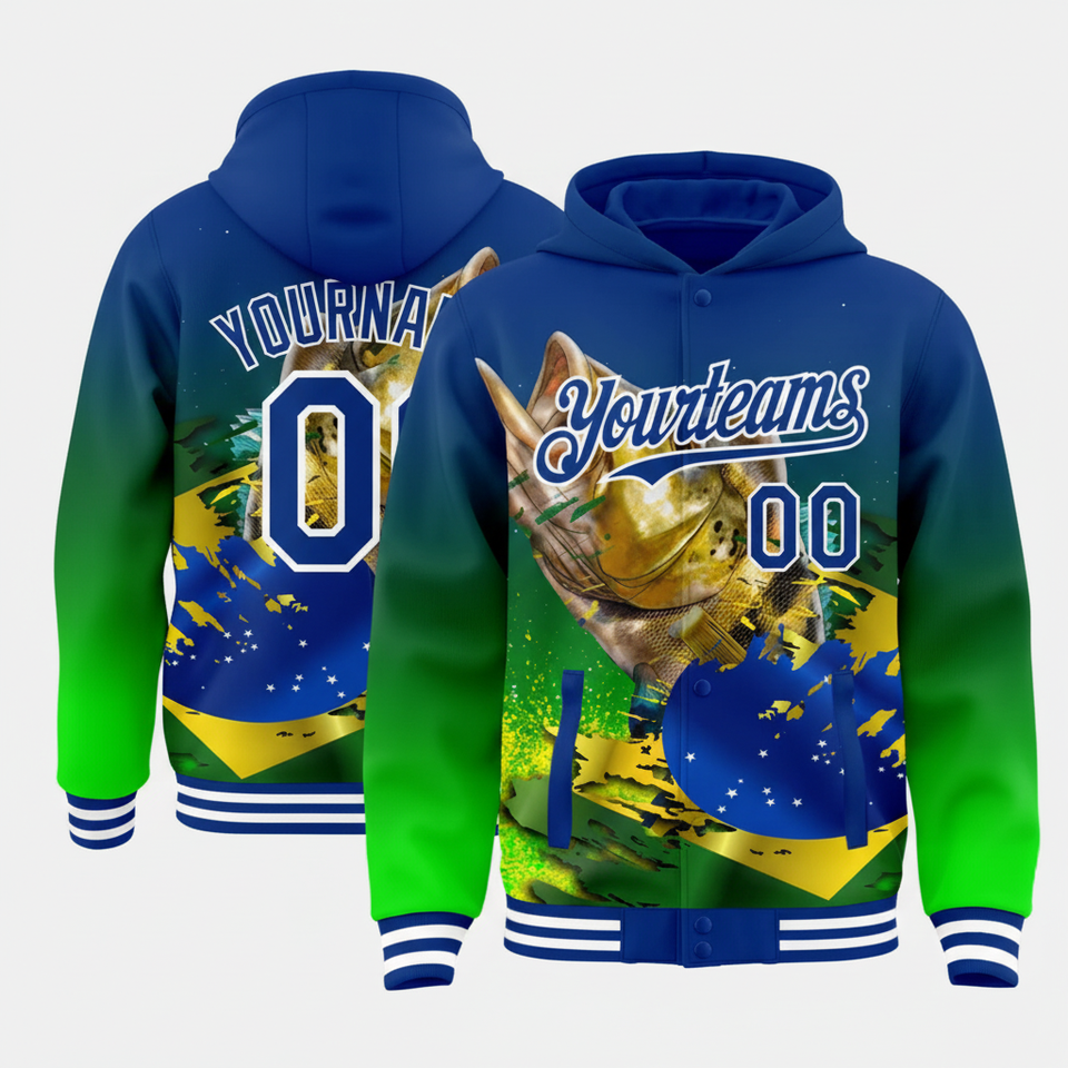 แจ็คเก็ตมีฮู้ดสไตล์ทีมรอยัลนีออนสีเขียว-ขาวใหญ่, 3D ตกปลาบอมเบอร์นักตกปลา