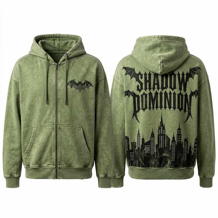 เสื้อฮู้ดซิปสีเขียวเซจแบบสั่งทำพิเศษ สไตล์สตรีทแวร์ ล้างสีแบบแอซิดวอช เสื้อฮู้ดผู้ชาย พิมพ์ลายกราฟิกเมือง ผ้าฟลีซหนานุ่ม ผลิตโดยผู้ผลิตเสื้อแจ็คเก็ต