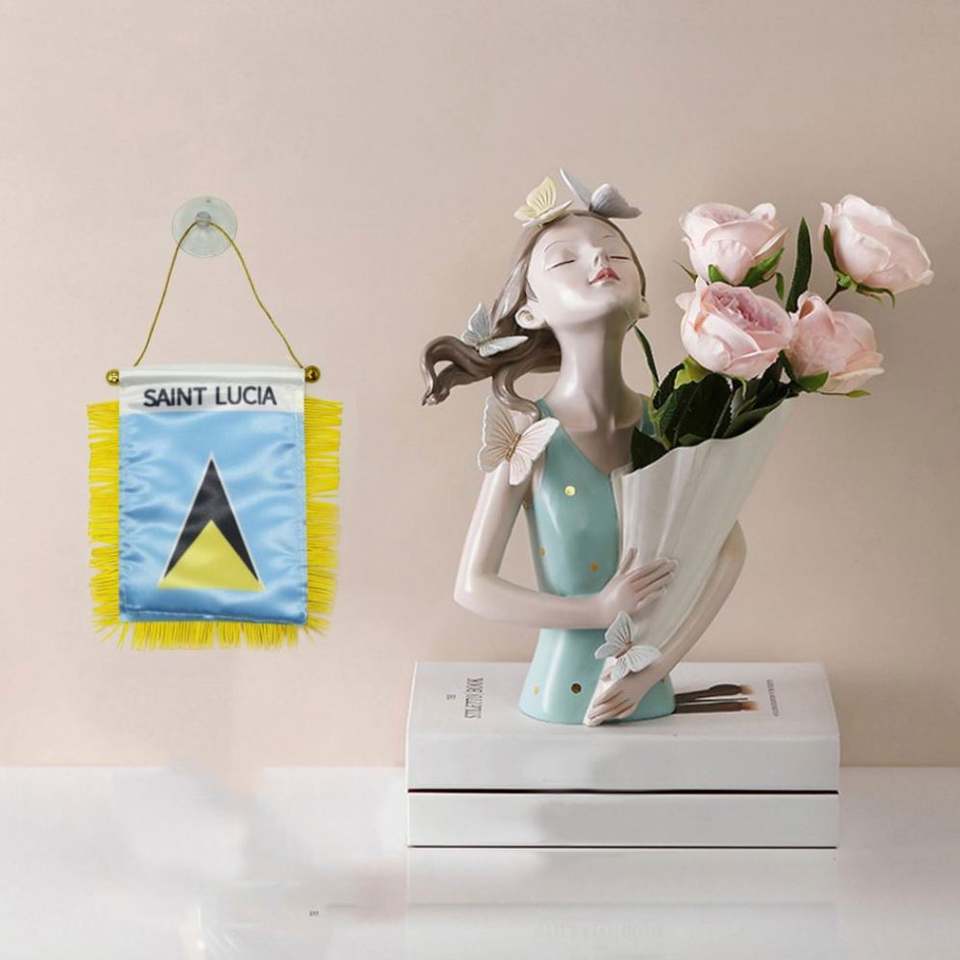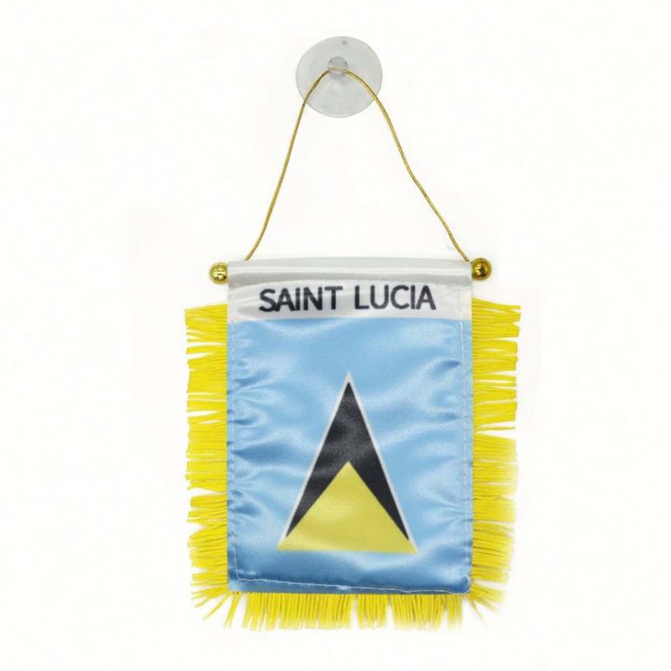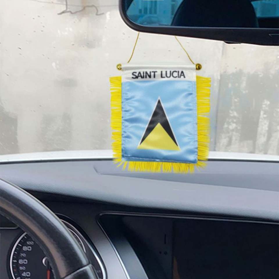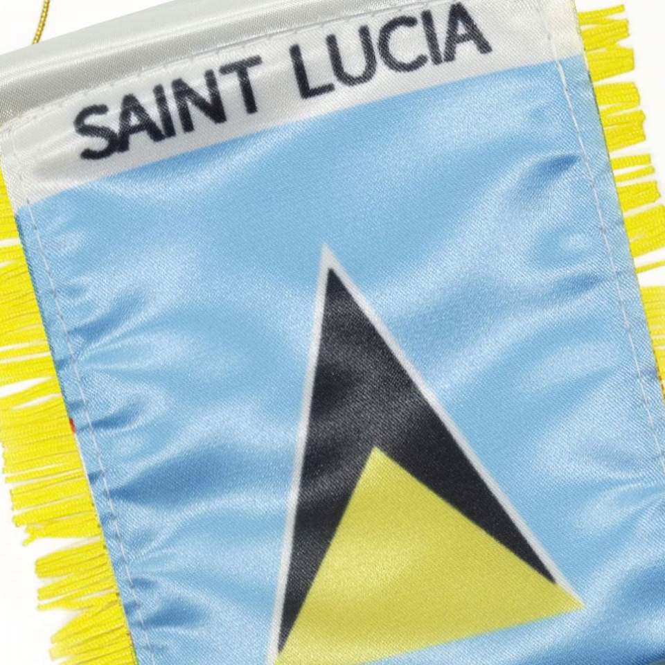 ธงติดรถยนต์ขนาดเล็กแบบกำหนดเองของเซนต์ลูเซีย ทำจากผ้าซาติน พร้อมพู่สีเหลือง พิมพ์ลายดิจิทัล วัสดุโพลีเอสเตอร์พลาสติก สำหรับใช้กับยานยนต์