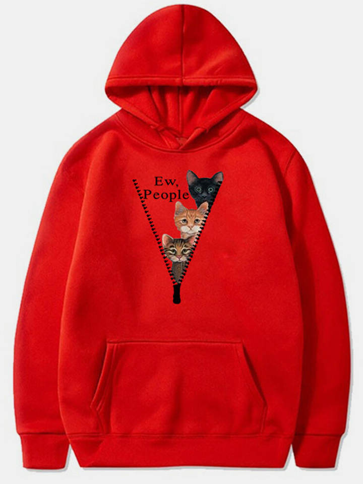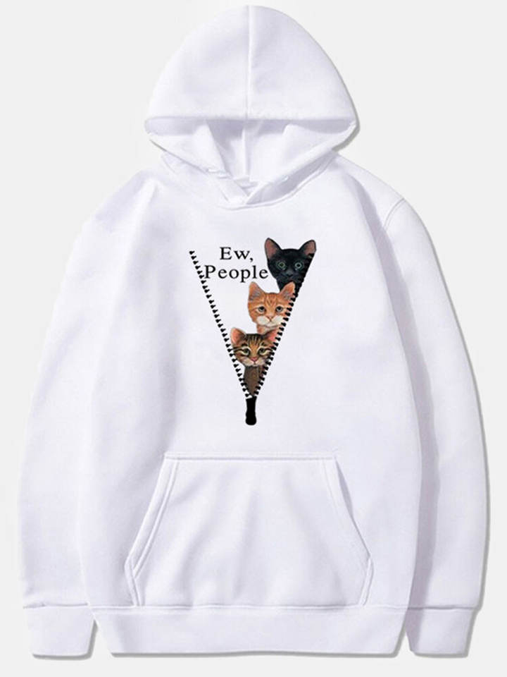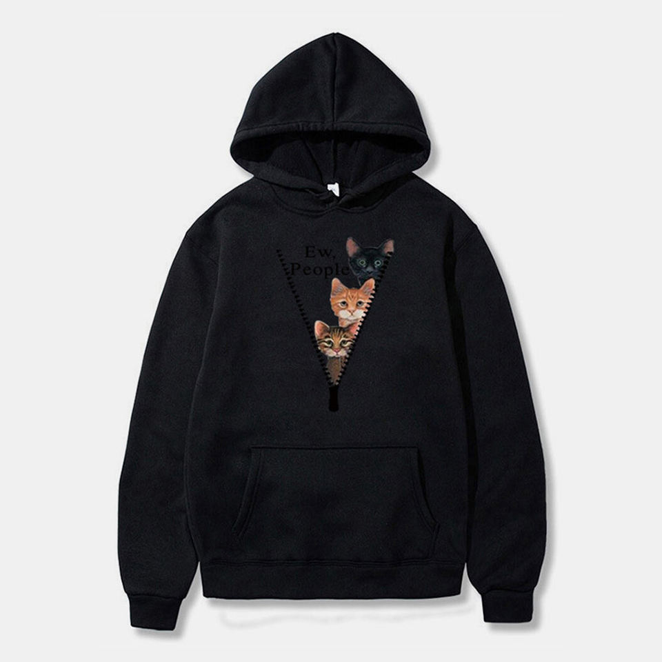 เสื้อฮู้ดสวมหัวโอเวอร์ไซส์ของผู้หญิงเสื้อสเวตเชิ้ตผ้าถักสีพื้นพิมพ์ลายแมวลำลองฤดูหนาว