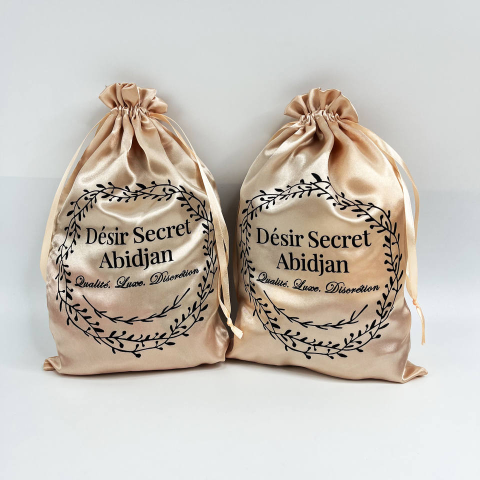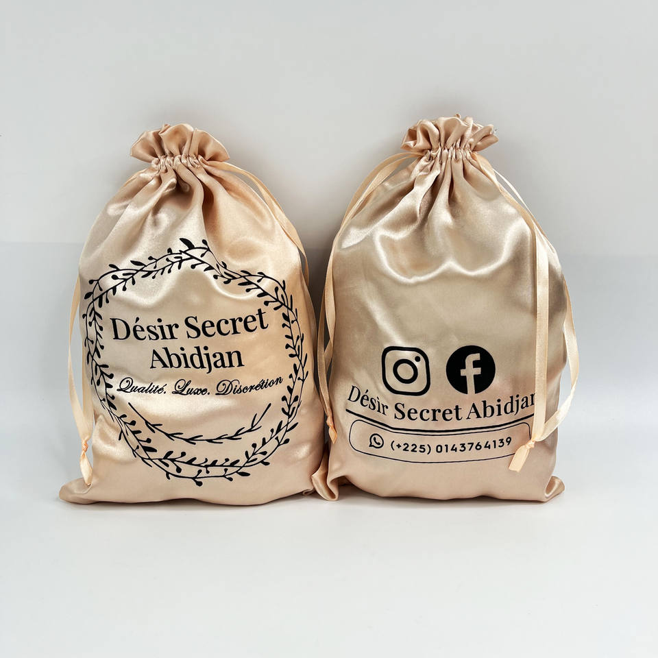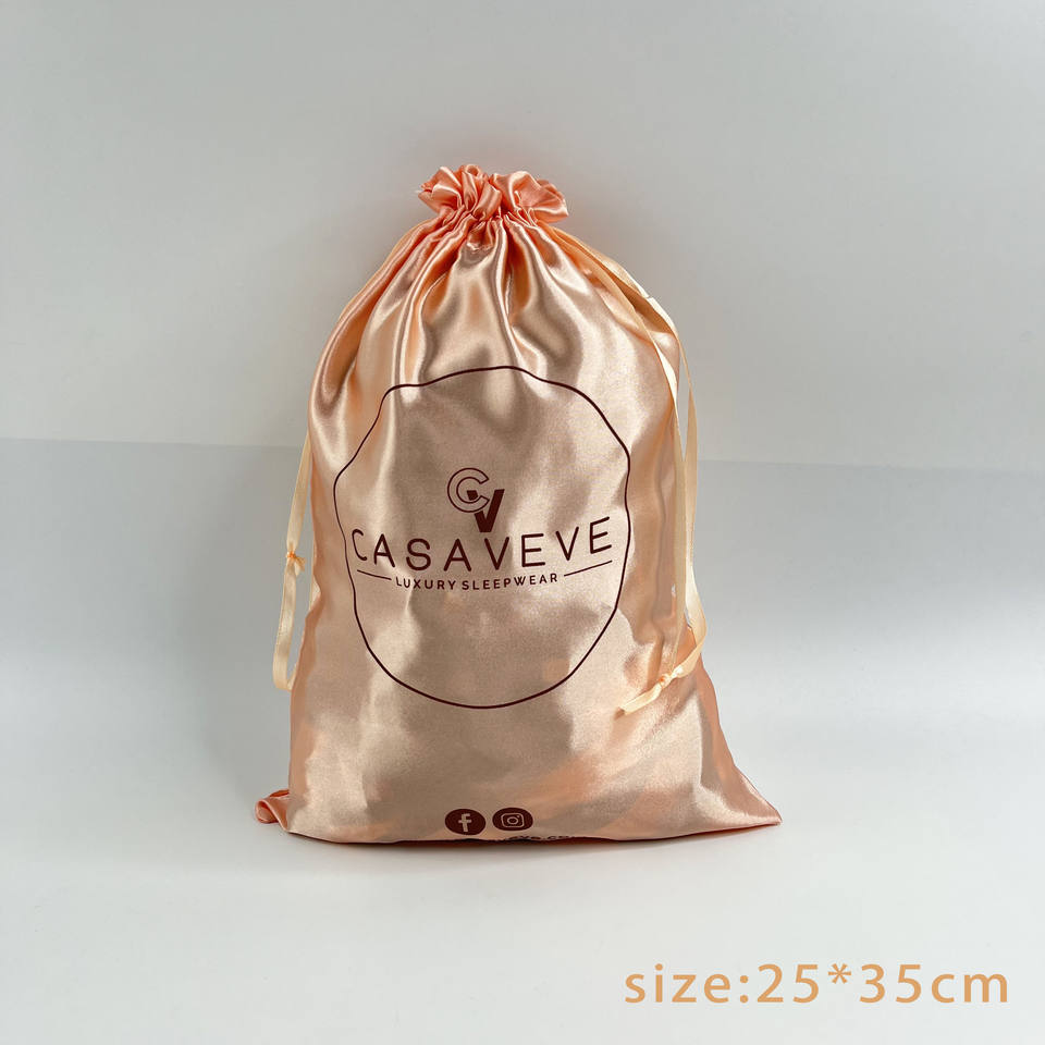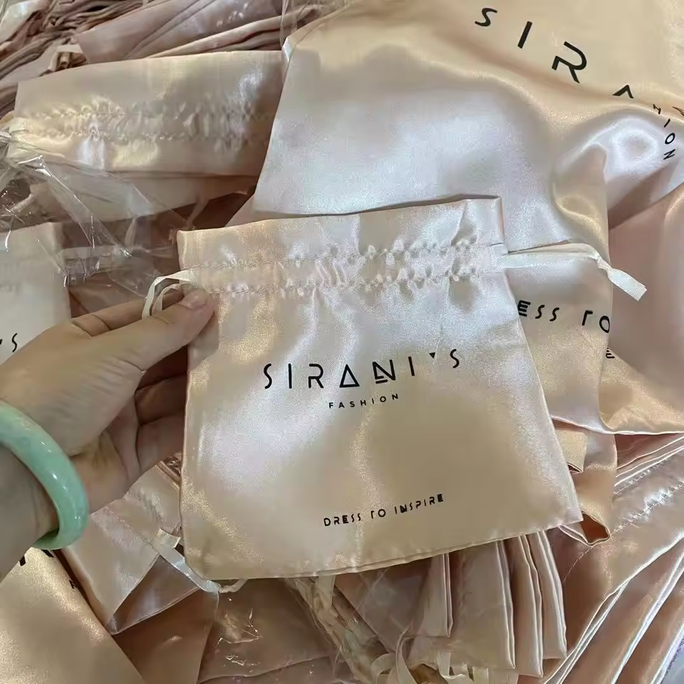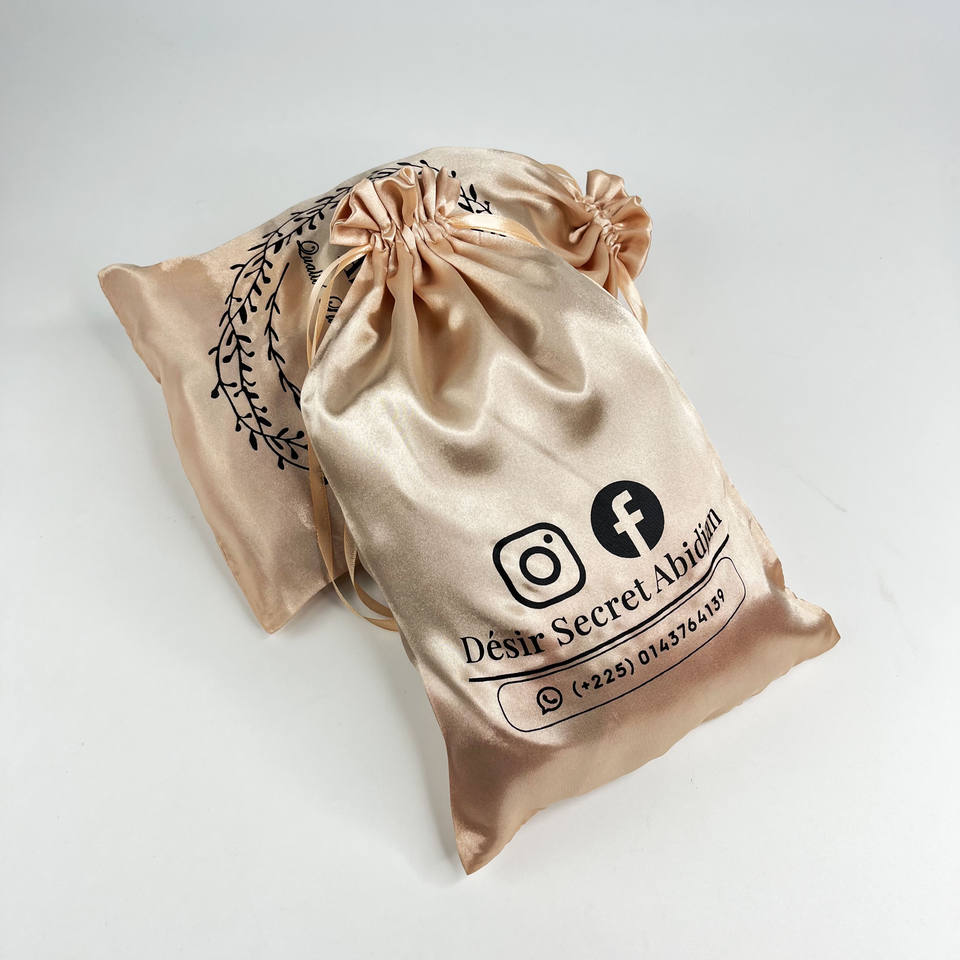 ถุงผ้าซาตินแบบมีเชือกผูกพร้อมหูริบบิ้นและลายตัวอักษร ถุงผ้าซาตินแบบมีเชือกผูกพร้อมโลโก้พิมพ์