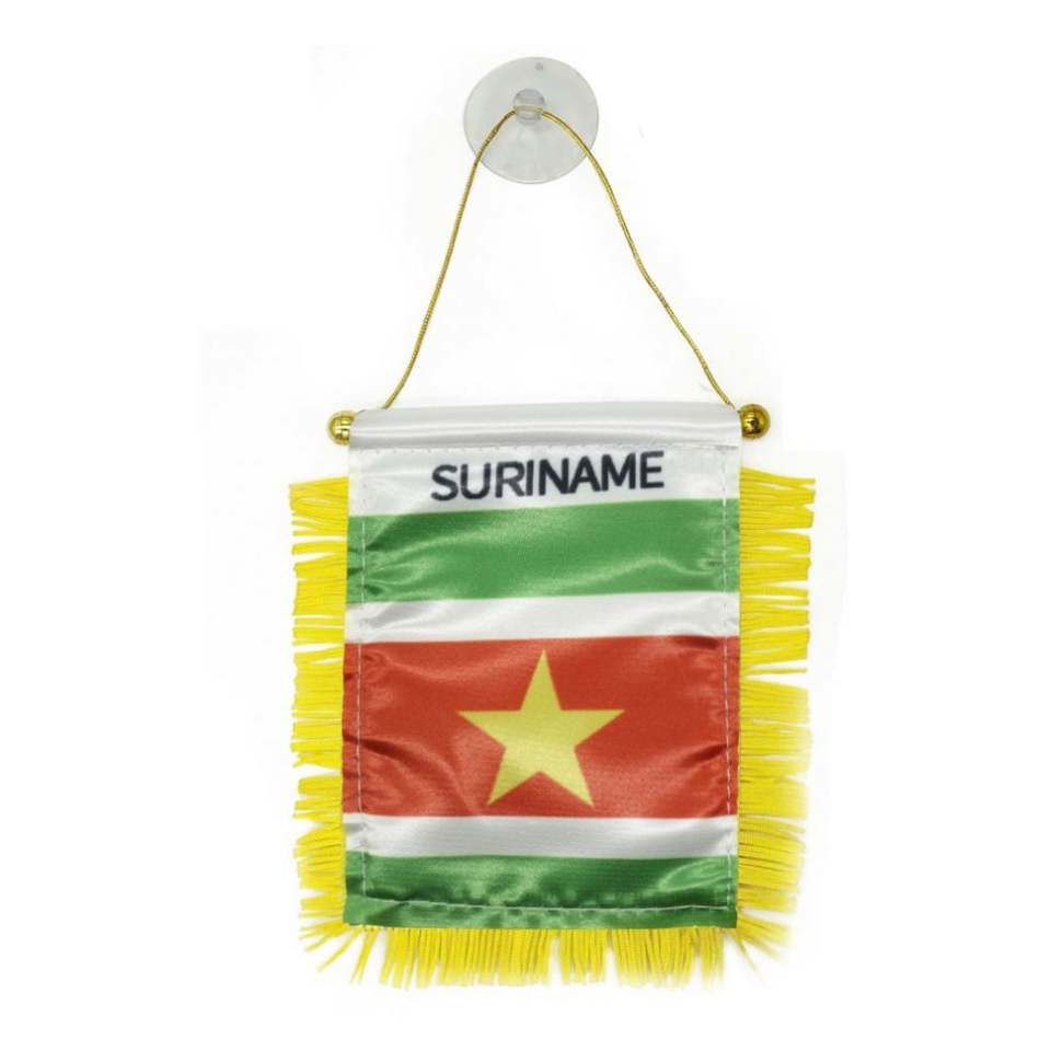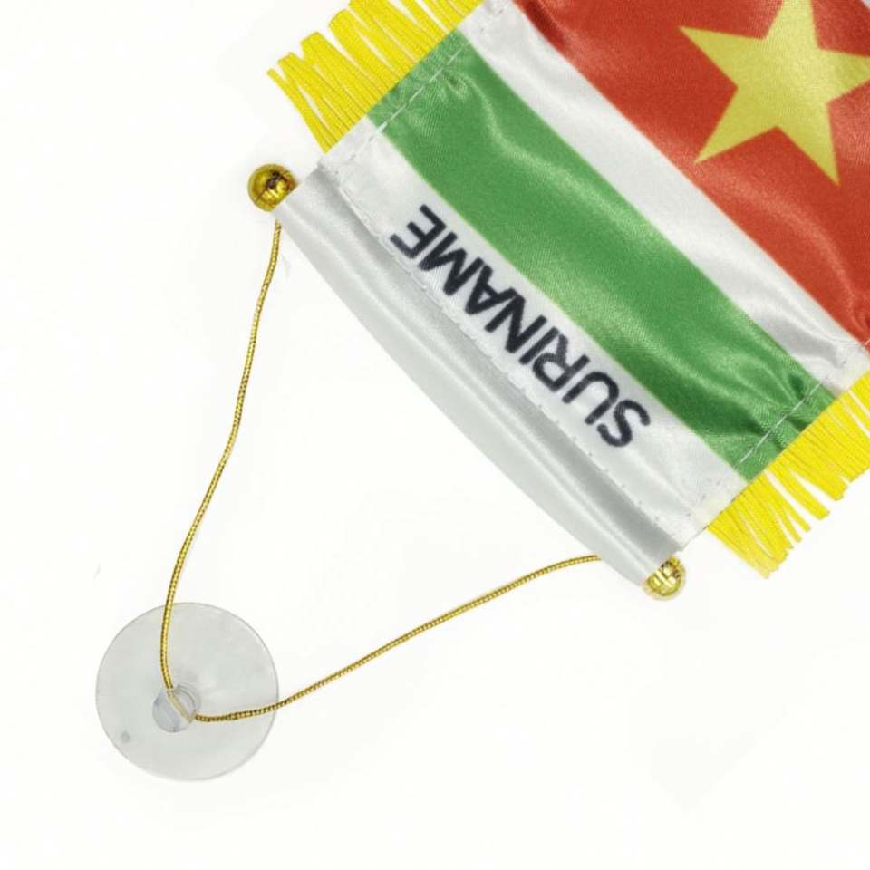 ธงซาตินแบบกำหนดเอง ธงรถยนต์ขนาดเล็ก พู่สีเหลือง ผลิตด้วยโพลีเอสเตอร์พลาสติก สำหรับใช้ในยานยนต์ ธงซาตินซูรินาม