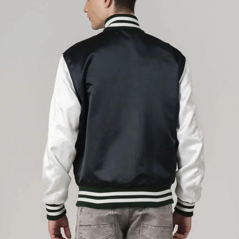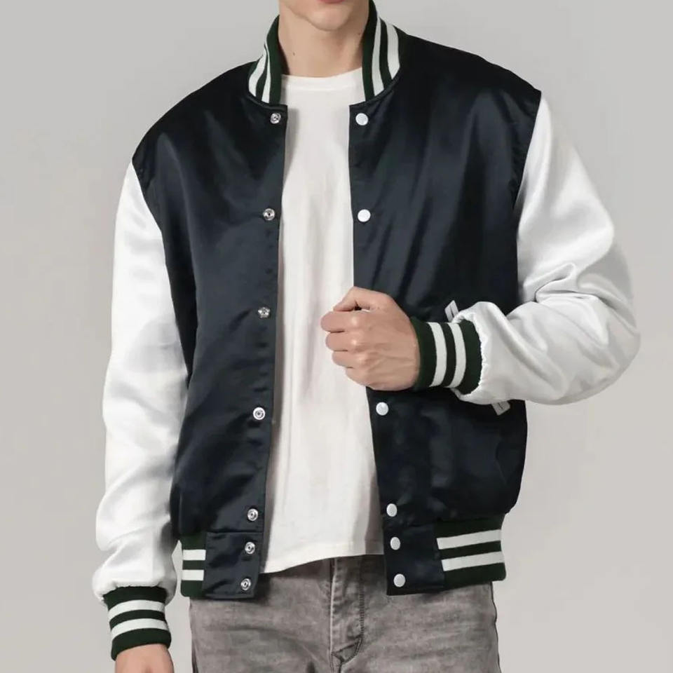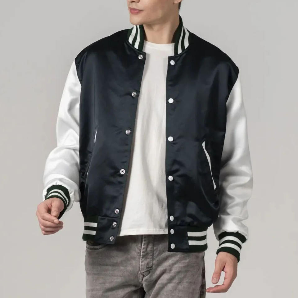 เสื้อแจ็กเก็ตเบสบอลผ้าซาตินตามสั่งเสื้อโค้ทเสื้อบอมเบอร์ทีมีความเงางามเสื้อโค้ทแบบมีคอตั้งระบายอากาศได้สำหรับฤดูหนาว