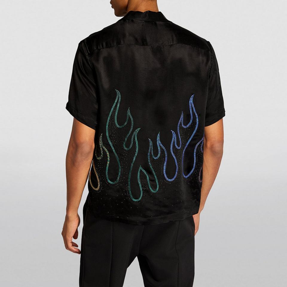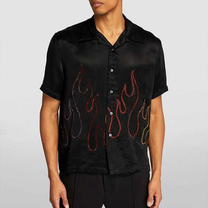 เสื้อเชิ้ตฮาวายผู้ชายแขนสั้นผ้าซาตินไหมพิมพ์ลายเปลวไฟประดับเพชรพลอยสไตล์ลำลองสำหรับฤดูร้อน