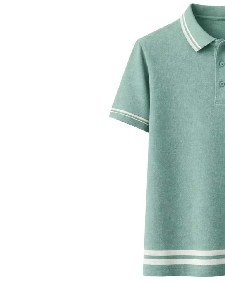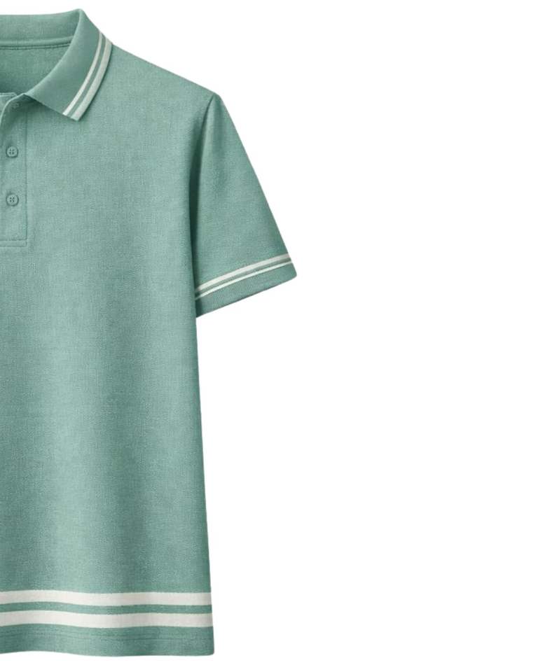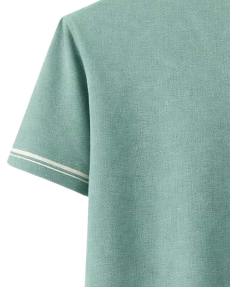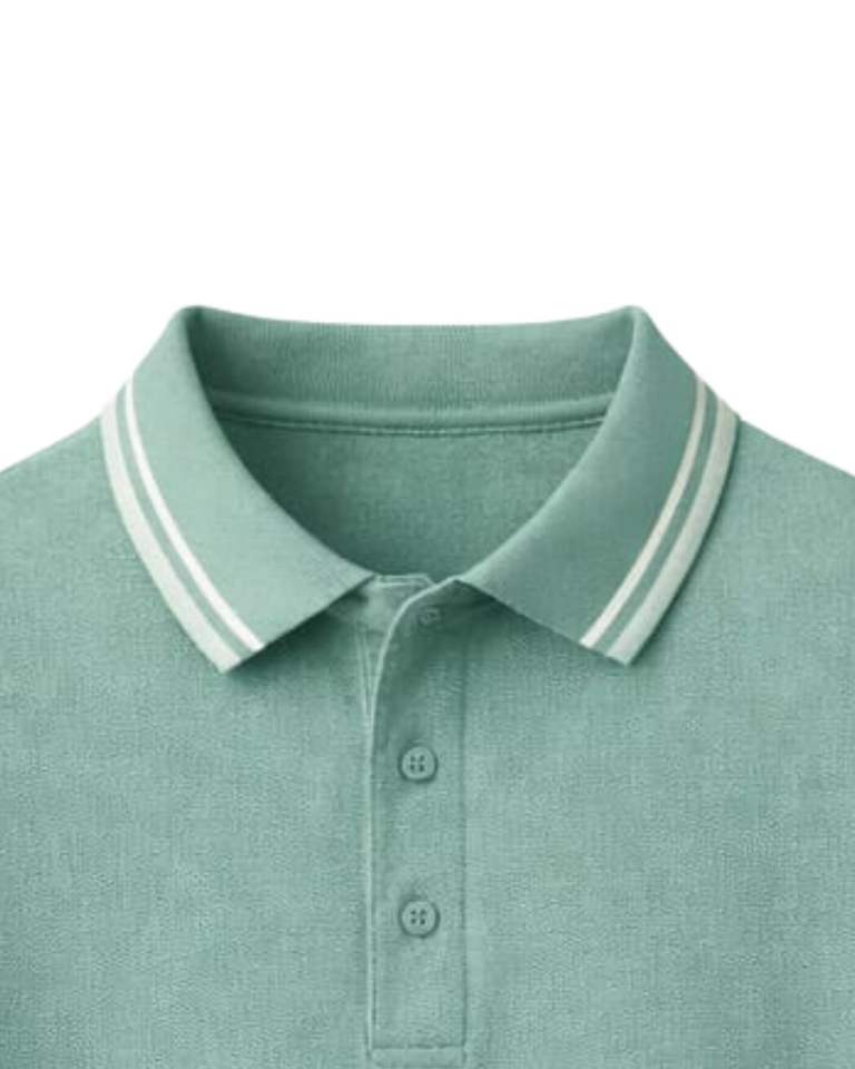 เสื้อโปโลชายสีเขียวทะเลแบบกำหนดเอง ผ้าคอตตอนผสม สวมใส่สบาย แขนสั้น เหมาะสำหรับฤดูร้อน ดีไซน์คอปก แขนเสื้อ และชายเสื้อแบบมีแถบสีตัดกัน