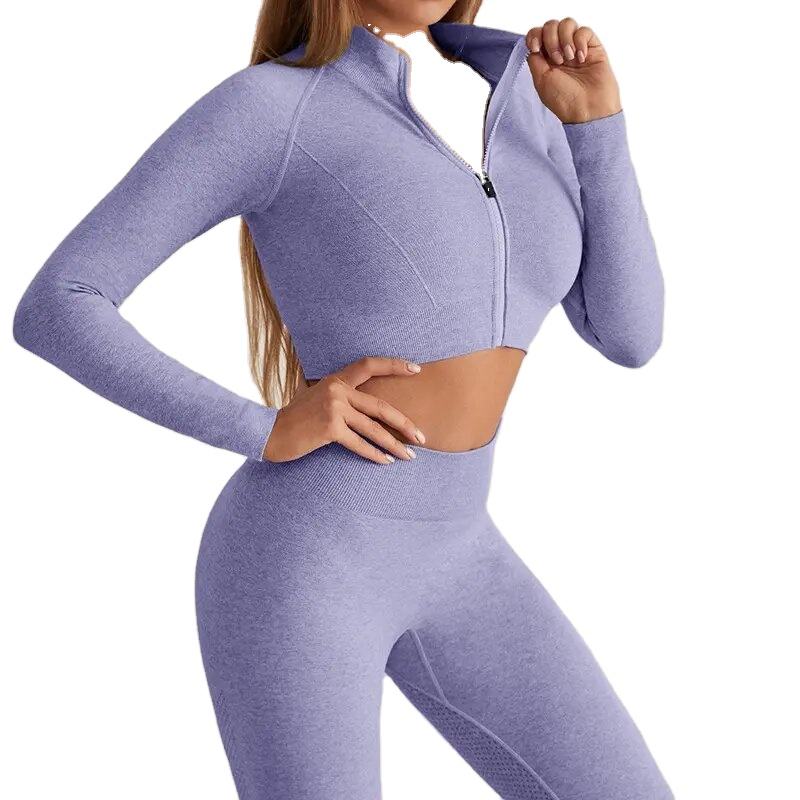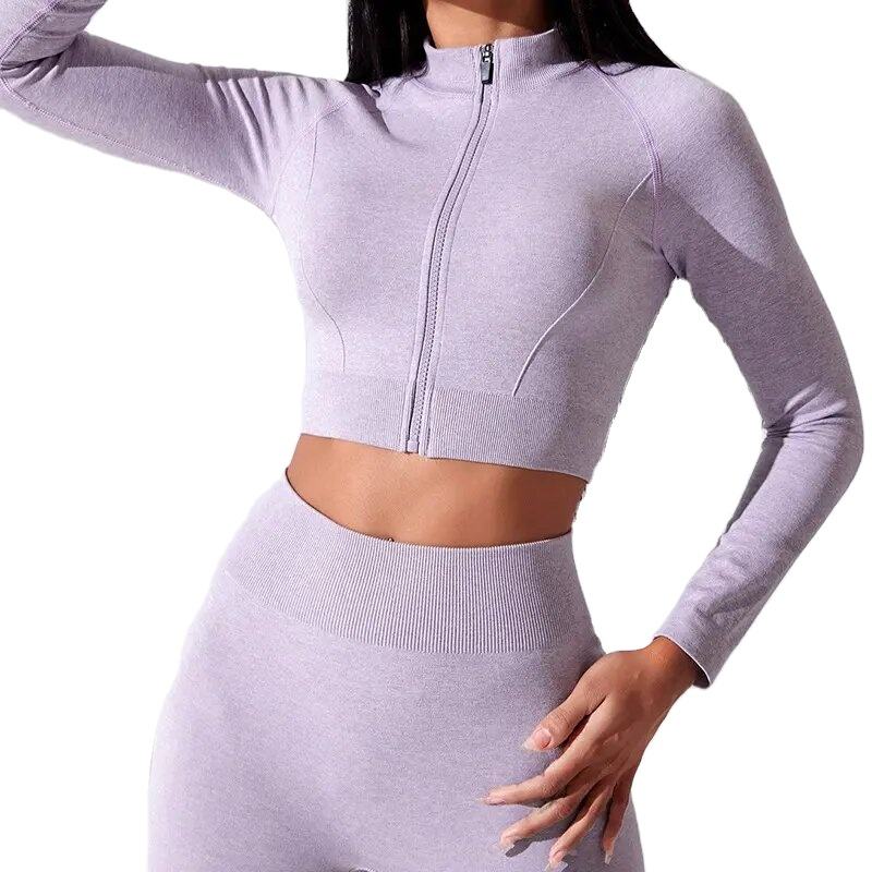ชุดโยคะไร้รอยต่อสำหรับผู้หญิงแขนยาวมีซิปกางเกงฟิตเนสเอวสูงและเสื้อครอป