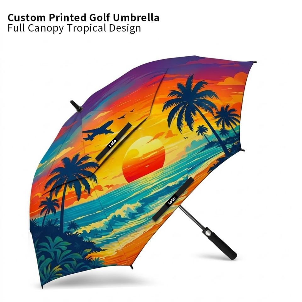 ร่มกอล์ฟกึ่งอัตโนมัติแบบกำหนดเอง พิมพ์ลายทรอปิคอลซันเซ็ททั้งใบ ขนาดใหญ่ กันลม เปิดอัตโนมัติ สำหรับกันฝนกลางแจ้ง