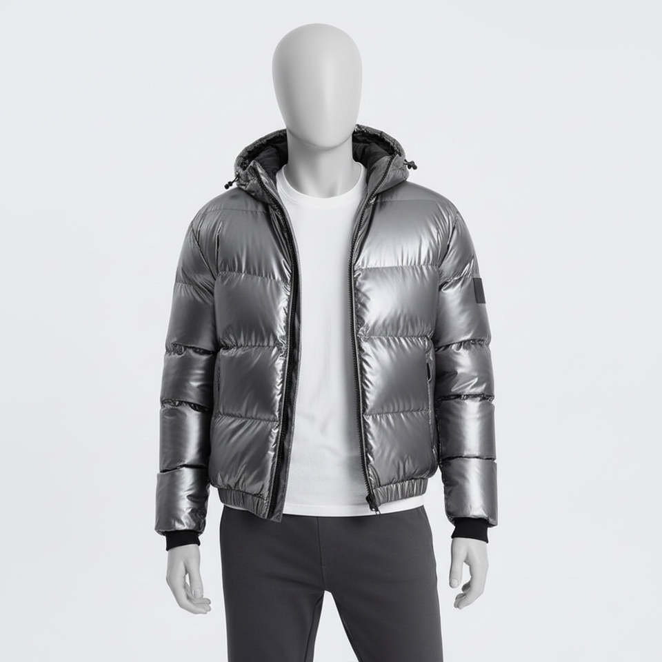 เสื้อแจ็คเก็ตพัฟเฟอร์บุฉนวนกันหนาวสีเงินเงาแบบกำหนดเอง มีฮู้ด ซิปปิด น้ำหนักเบา กันลม ทรงสแตนด์ ไซส์พลัส สำหรับผู้ชาย