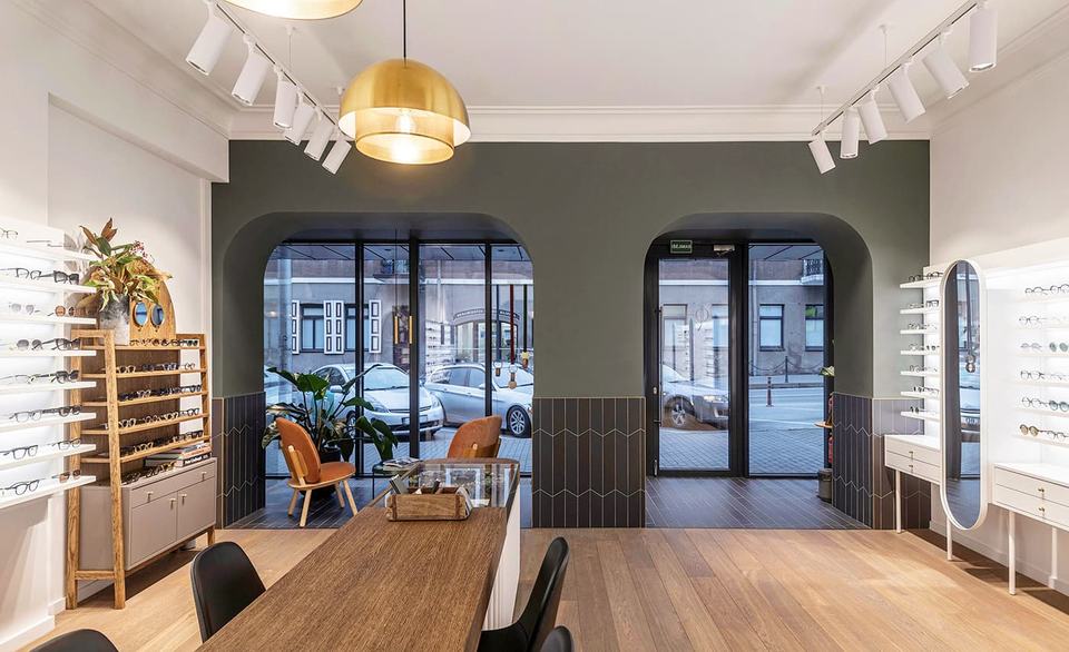 โต๊ะทำงานไม้ LED สำหรับใส่แว่นตาร้านค้าปลีกการออกแบบตกแต่งภายในที่ดีที่สุดสำหรับร้านขายแว่นตา