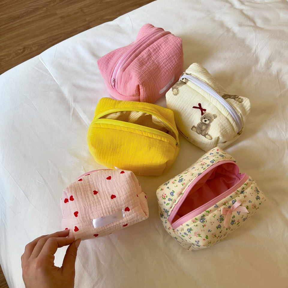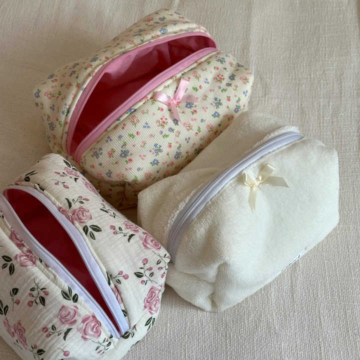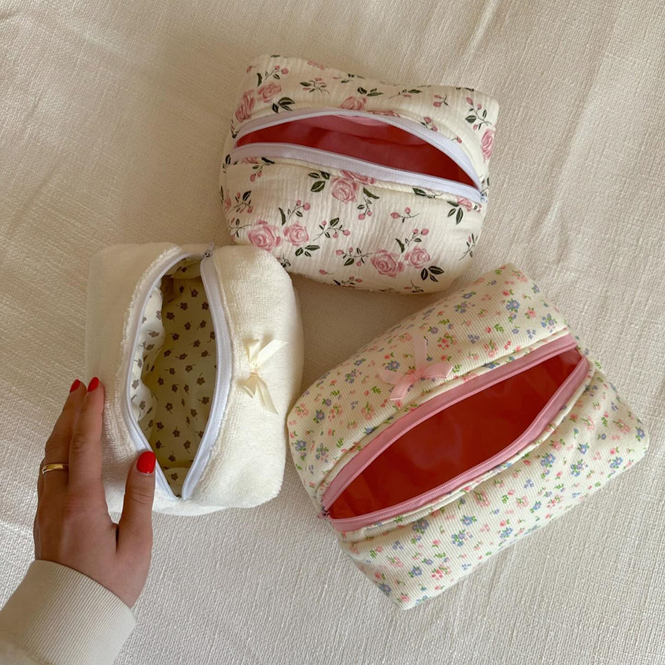 กระเป๋าเก็บของจำเป็นสำหรับเดินทางเครื่องสำอางผ้าฝ้ายยับลายดอกไม้ออกแบบโลโก้ขนาดตามสั่ง