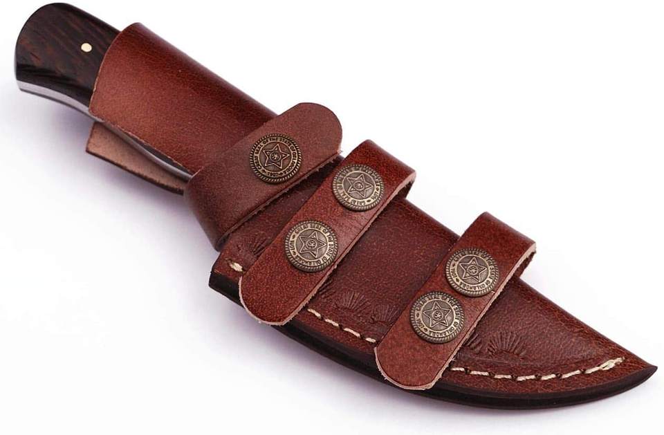 มีดใบมีดคงที่ทำด้วยมือสำหรับล่าสัตว์กลางแจ้งด้วยปลอกหนังมีดเหล็กดามัสกัสขนาดที่กำหนดเอง