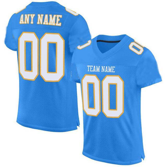 เสื้อฟุตบอลสีฟ้าท้องฟ้าที่กำหนดเองพร้อมหมายเลขทีมร่างสีขาวทองชุดเกมตาข่ายระบายอากาศ