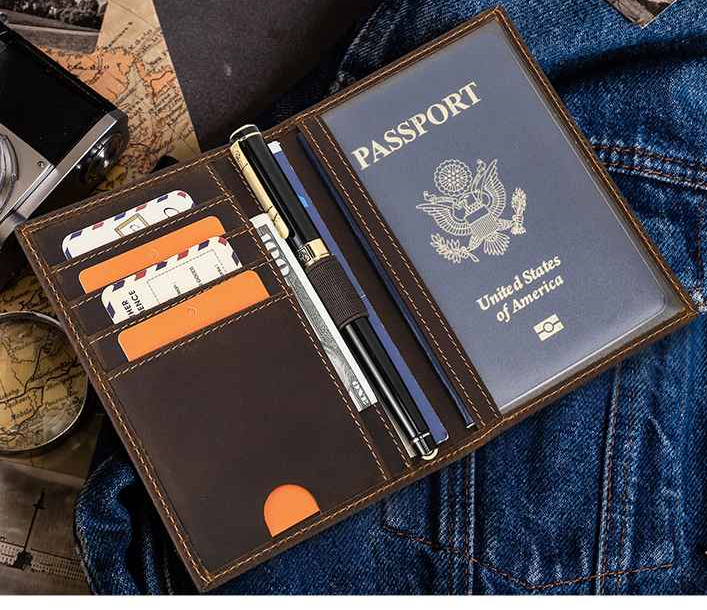 กระเป๋าเงินหนังม้าแบบบางออกแบบได้ตามต้องการมีช่องเปิดกระเป๋าสตางค์หนังสือเดินทาง RFID และช่องใส่บัตรเครดิตความยาวสั้นโดย Anwar