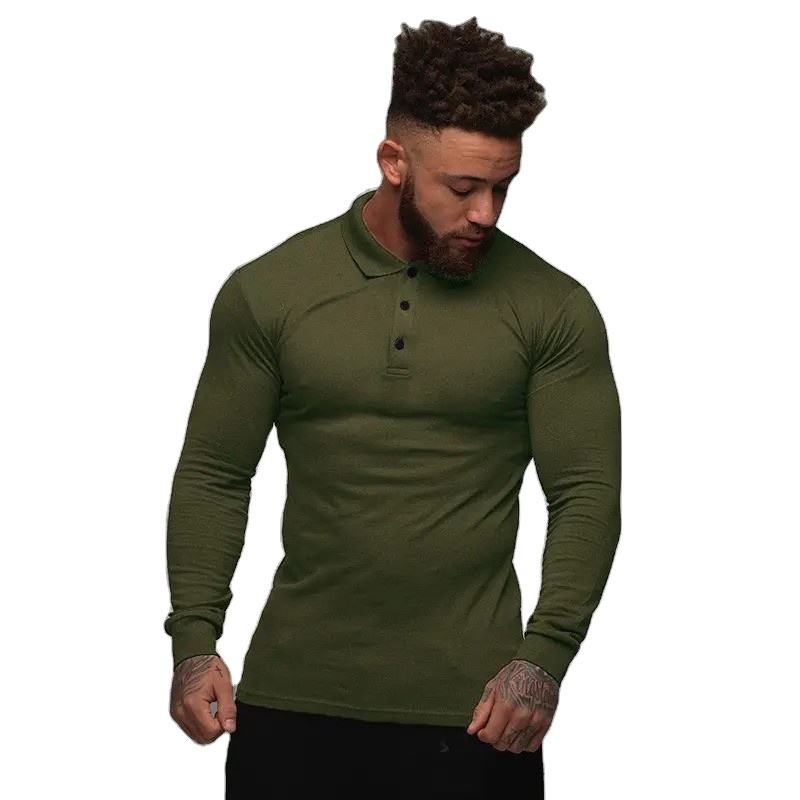 เสื้อยืดโปโลแขนยาวสำหรับออกกำลังกายเล่นฟิตเนสของผู้ชายเสื้อคอปกมีกระดุมปกคอเสื้อผ้าคอตตอน