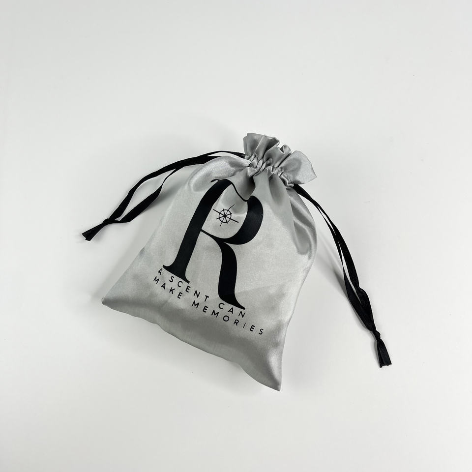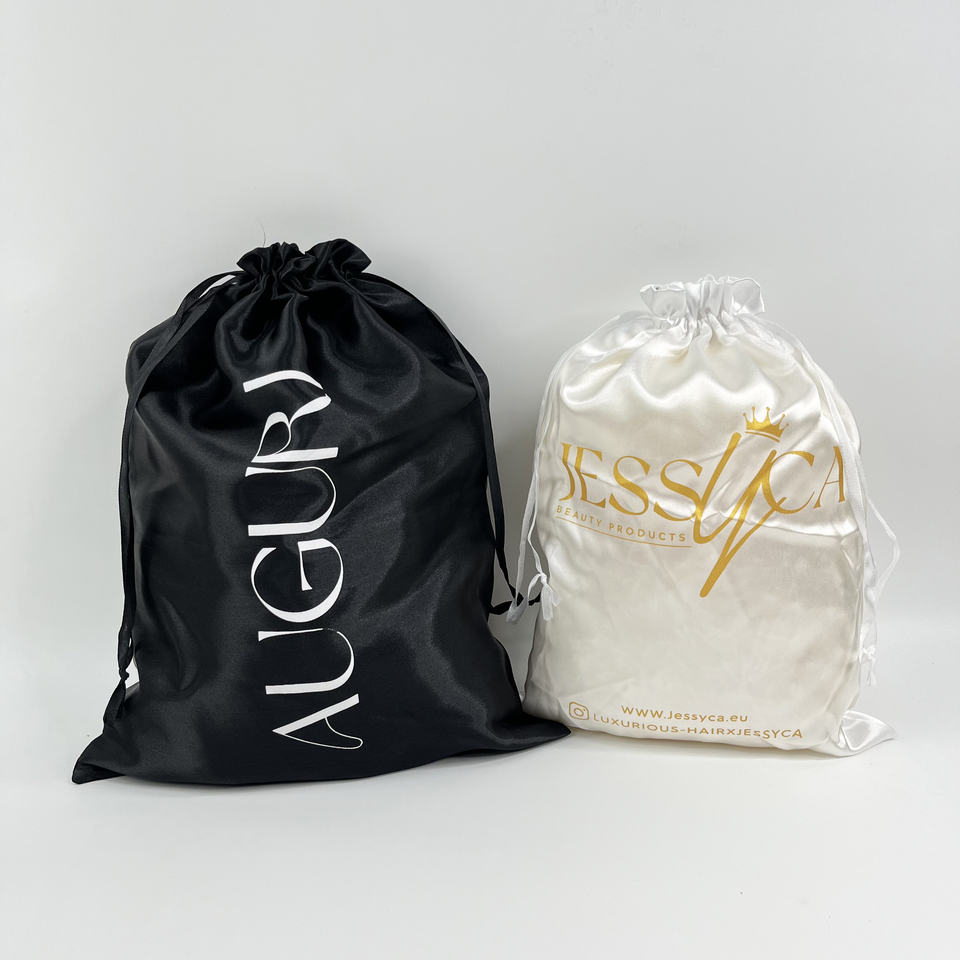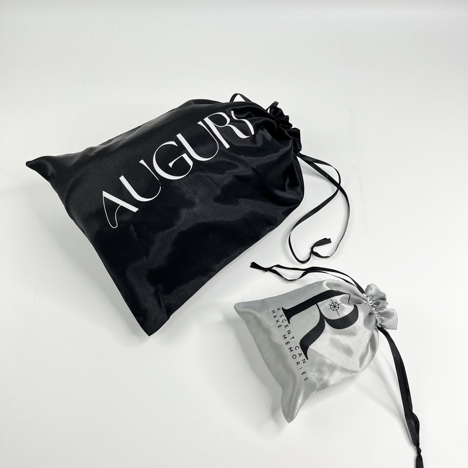 ถุงผ้าซาตินสีเงินแบบมีเชือกผูกพร้อมพิมพ์ฟอยล์สีทอง - บรรจุภัณฑ์แบรนด์หรูสำหรับเครื่องประดับและเครื่องสำอาง