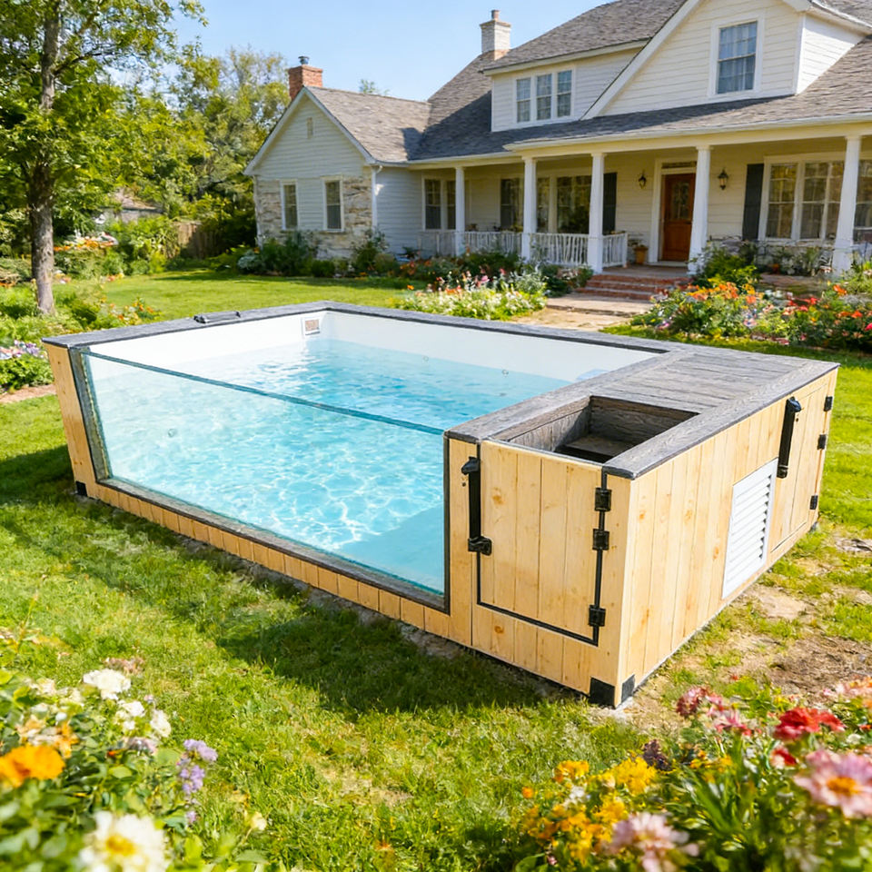 สระว่ายน้ำแบบตู้คอนเทนเนอร์ขนาดเล็กสำหรับครอบครัว ทำจากไฟเบอร์กลาส ทนรังสียูวี ทนการกัดกร่อน พร้อมหน้าต่าง สำหรับติดตั้งภายนอกอาคาร