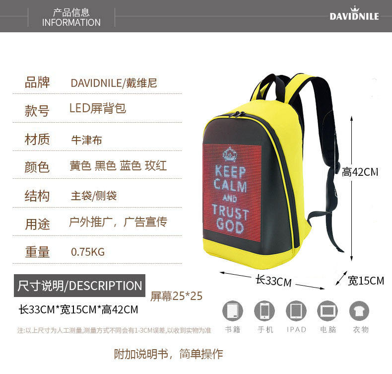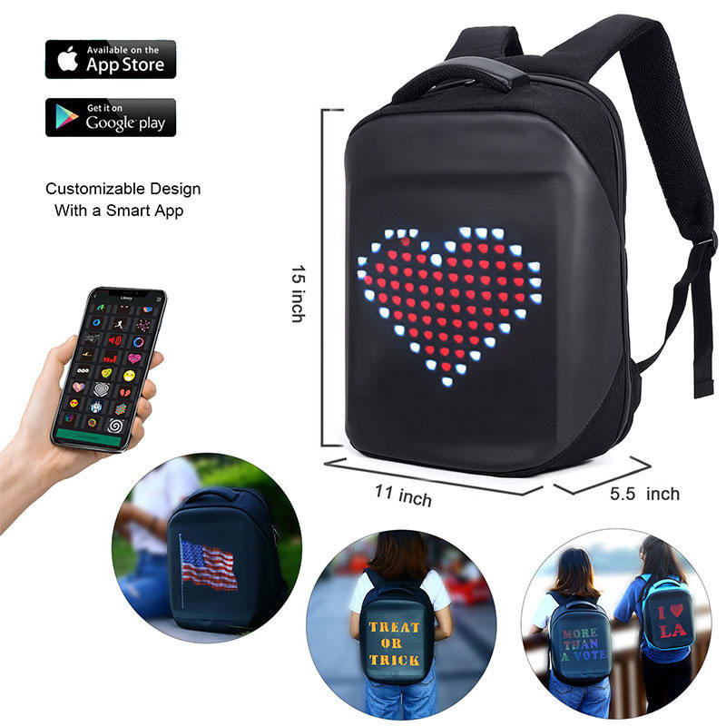 กระเป๋าเป้สะพายหลังจอ LED อัจฉริยะแบบกำหนดเอง สามารถใส่ GIF ภาพ ข้อความ ได้ บุด้วยผ้าโพลีเอสเตอร์เนื้อนุ่ม แบบมีซิปปิด