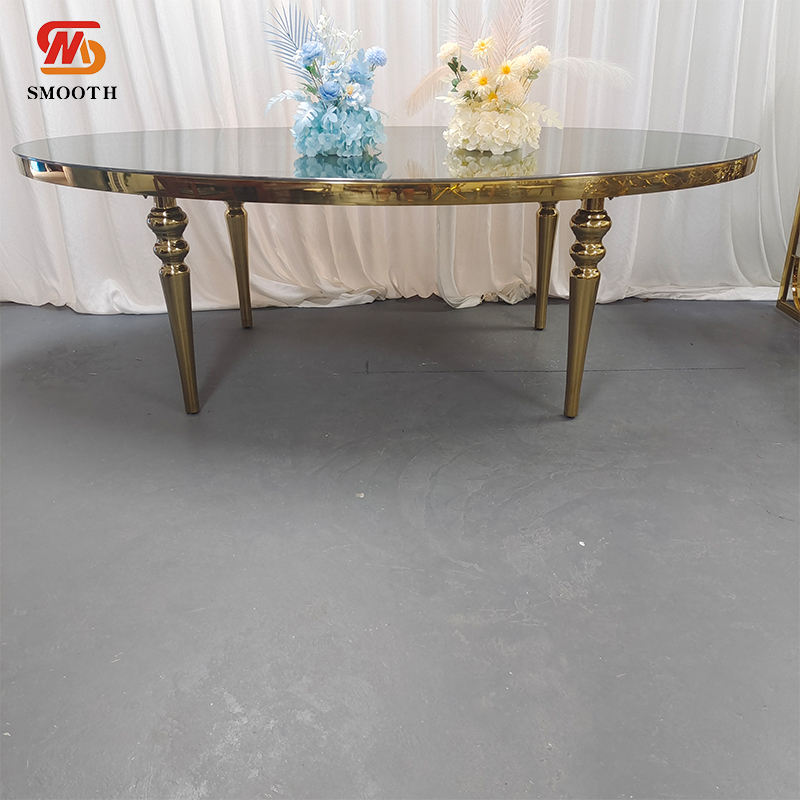 โต๊ะรับประทานอาหารทำจากแก้วใสโต๊ะรับประทานอาหารสีทองเฟอร์นิเจอร์โรงแรมทันสมัยสำหรับร้านอาหารงานแต่งงานงานตามสั่ง