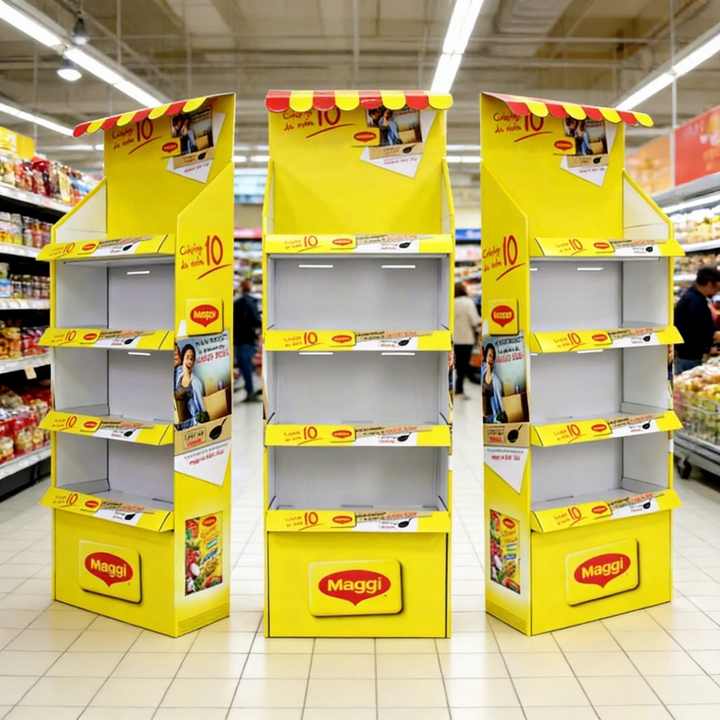 ชั้นวางสินค้าแบบตั้งพื้นสำหรับขนมขบเคี้ยว ขนมหวาน ผลิตภัณฑ์อาหาร ชิปส์ ลูกอม สำหรับร้านค้าปลีก ซูเปอร์มาร์เก็ต ทำจากกระดาษแข็ง