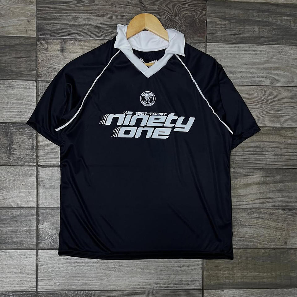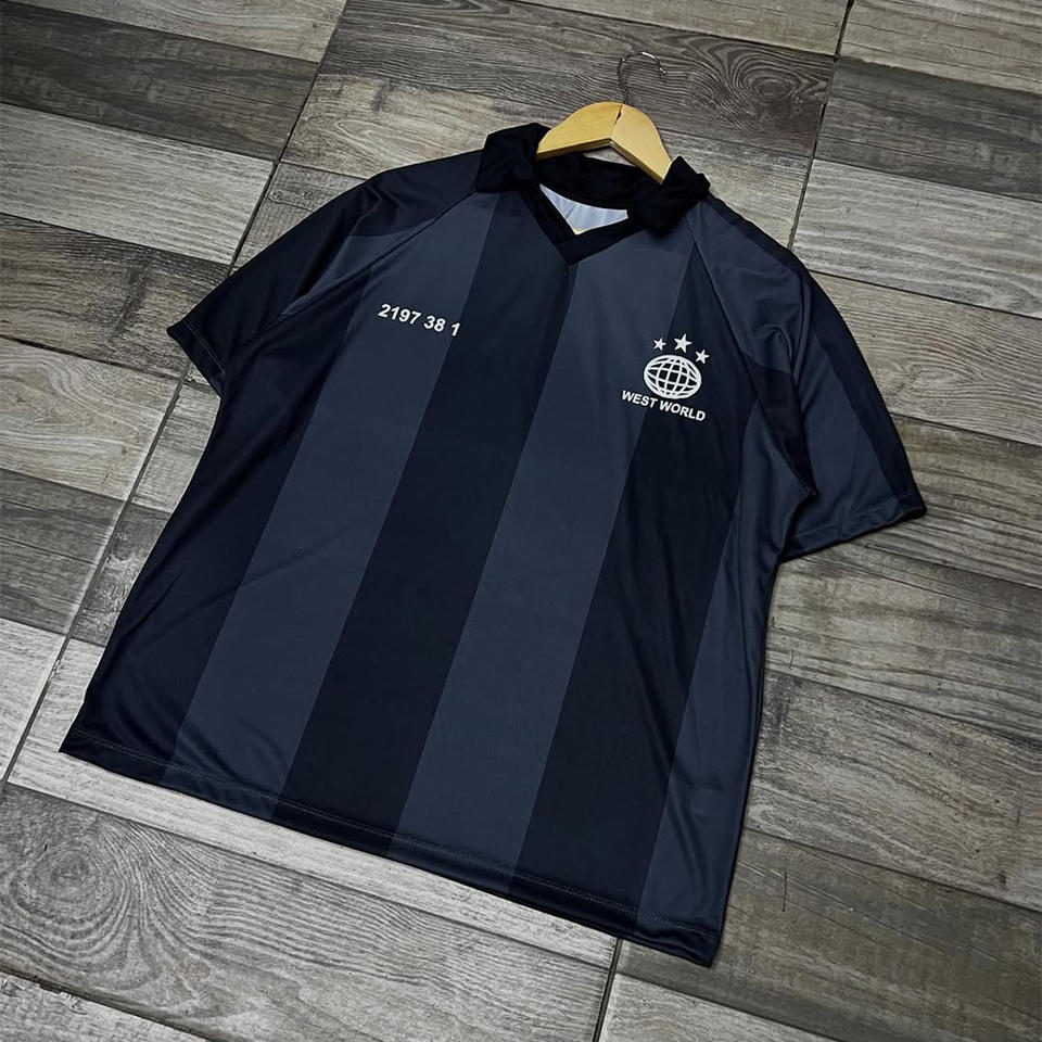 เสื้อฟุตบอลแบบสั่งทำ แฟชั่นพิมพ์ลายถัก 100% โพลีเอสเตอร์ เสื้อยืดแขนสั้นทรงโอเวอร์ไซส์สำหรับผู้ชาย