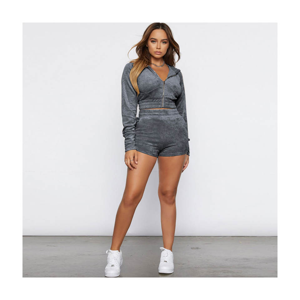 เสื้อฮู้ดครอปซิปสีพื้นแบบกำหนดเองพร้อมกางเกงขาสั้น ชุดเสื้อฮู้ดครอปแขนยาวสำหรับผู้หญิง ปี 2026
