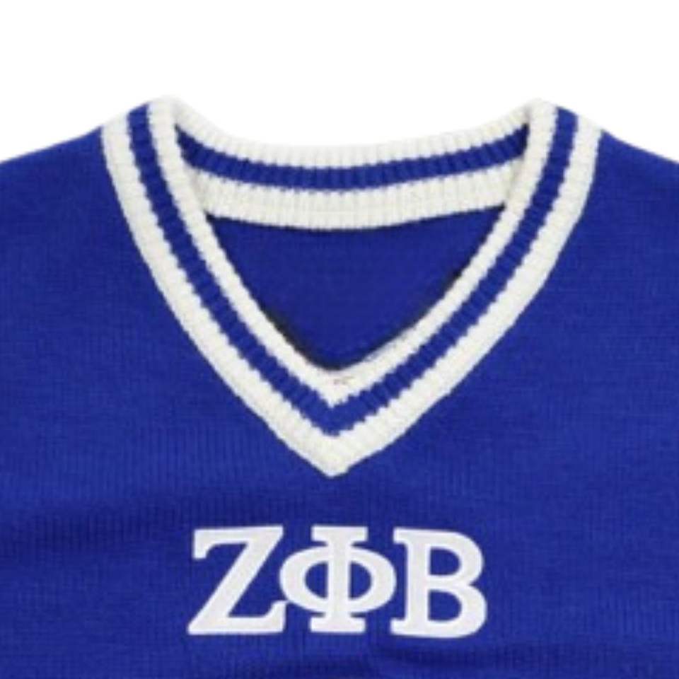 เสื้อสเวตเตอร์แบบสวมหัวคอวีสีฟ้าขาว Zeta phi Beta เสื้อถักเสื้อสวมหัวชาวกรีกขายส่ง