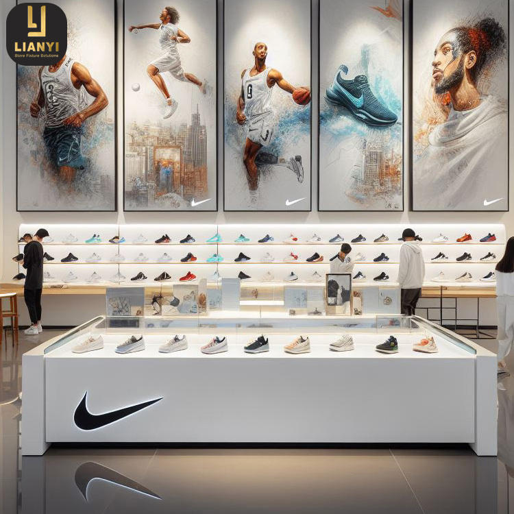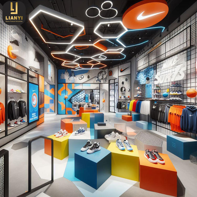 ชั้นวางรองเท้าแสดงสินค้าสำหรับตกแต่งในร้านเสื้อผ้าแนวสปอร์ตออกแบบตกแต่งภายในเฟอร์นิเจอร์ห้างสรรพสินค้า