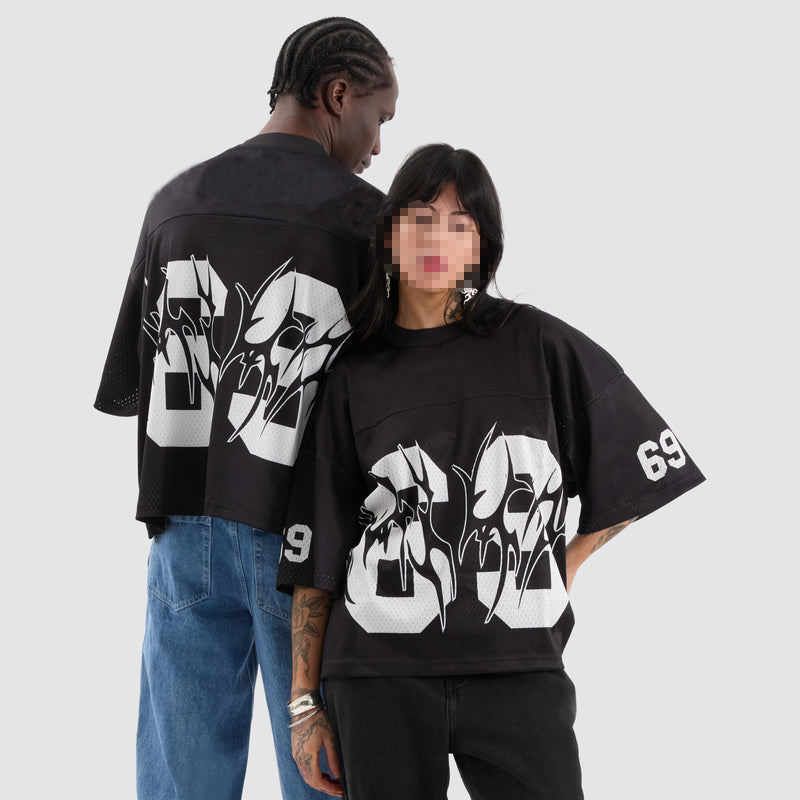 เสื้อยืดกีฬาตาข่ายออกแบบได้ตามต้องการสำหรับผู้ชายผู้หญิงเสื้อฟุตบอลปักลายทรงบ็อกซี่ฟิตไซส์ใหญ่กว่าปกติเสื้อฟุตบอลแฟชั่นพิมพ์ลายแบบถักจากสหรัฐอเมริกา