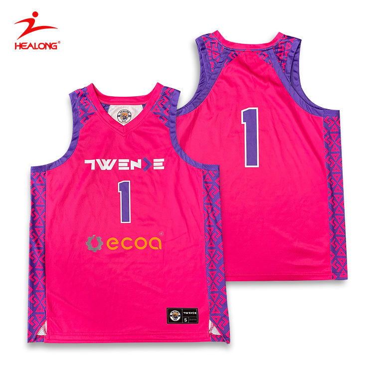 ชุดบาสเก็ตบอลสีชมพูพิมพ์ซับลิเมชันเต็มตัวดีไซน์กีฬาตามสั่ง