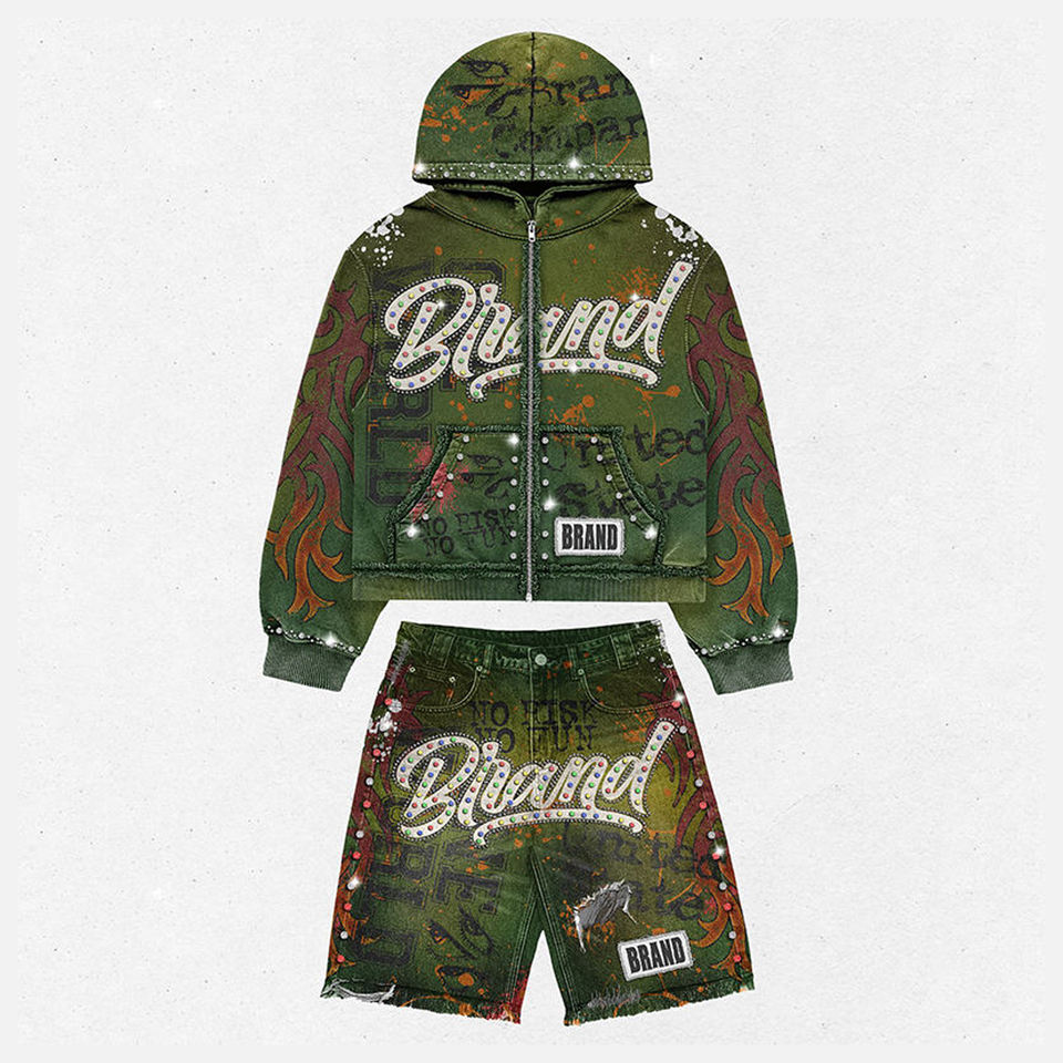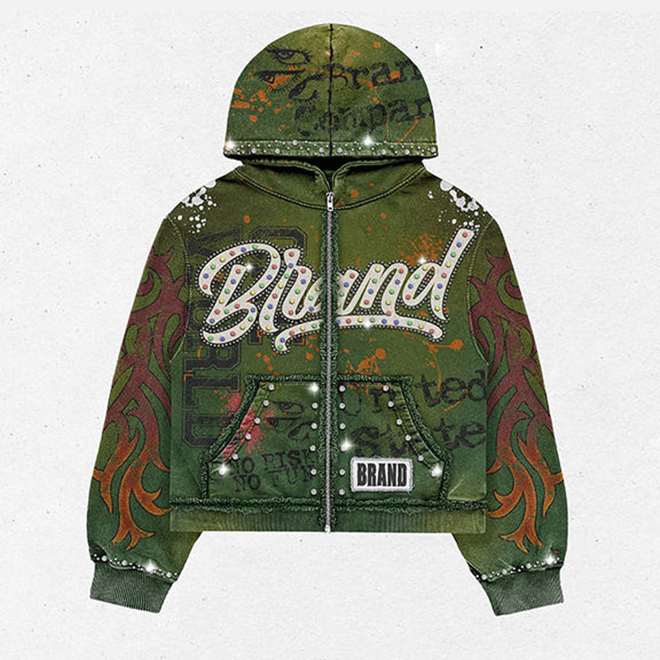 ชุดเซ็ตสตรีทแวร์สปอร์ตแบบโอเวอร์ไซส์ ซิปประดับเพชร ฮู้ดดี้ฟอกสีสไตล์วินเทจ ปักลายเสือดาว ผ้าฟลีซระบายอากาศได้ดี