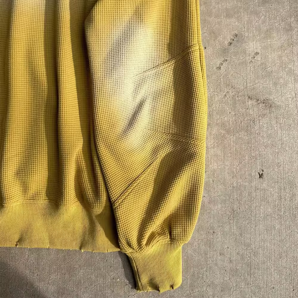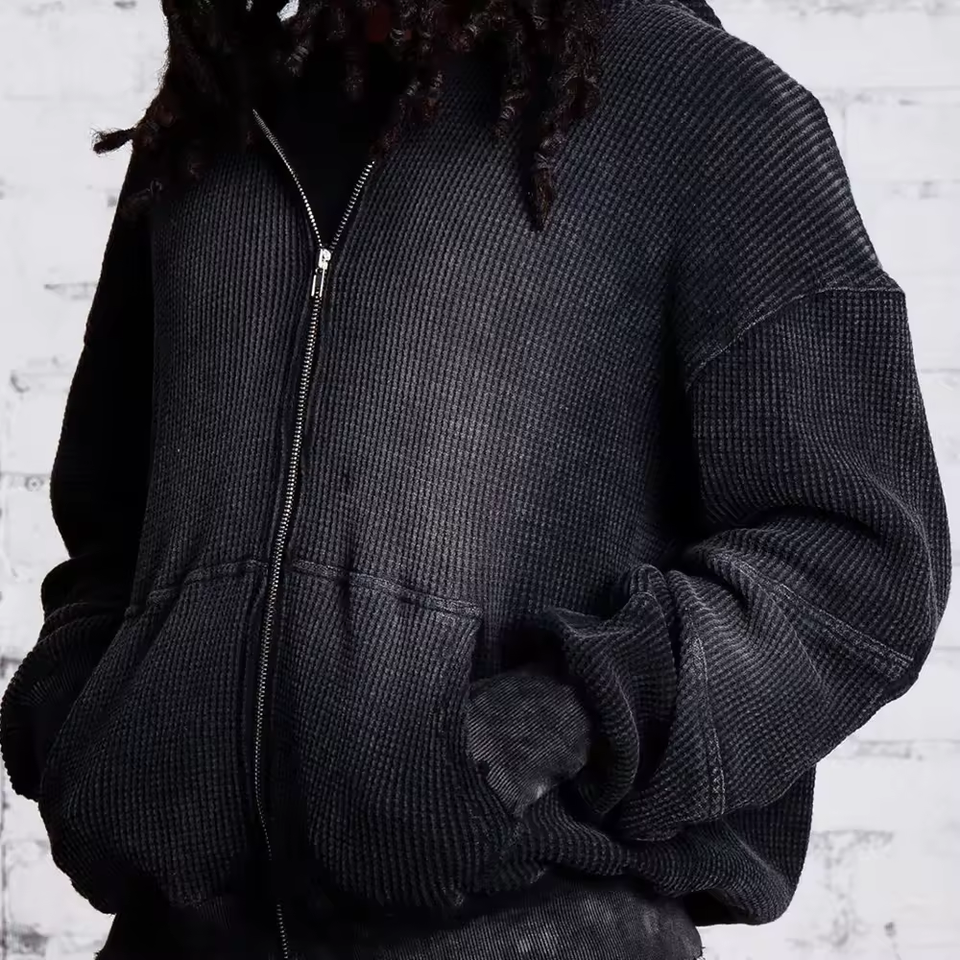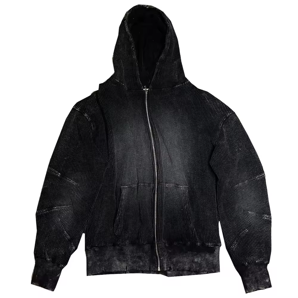 เสื้อฮู้ดซิปผู้ชายผ้าฝ้าย 100% สไตล์วินเทจสีซีดแบบย้อมสีแบบแอซิดวอช ลายวาฟเฟิล ให้ความอบอุ่น พร้อมดีไซน์ขาดๆ แบบดิสเทรส