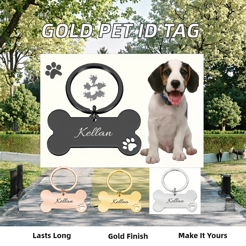 ป้ายชื่อสุนัขสแตนเลสสตีลชุบทองขัดเงา พิมพ์ลายดิจิตอล ทนทาน สลักชื่อได้